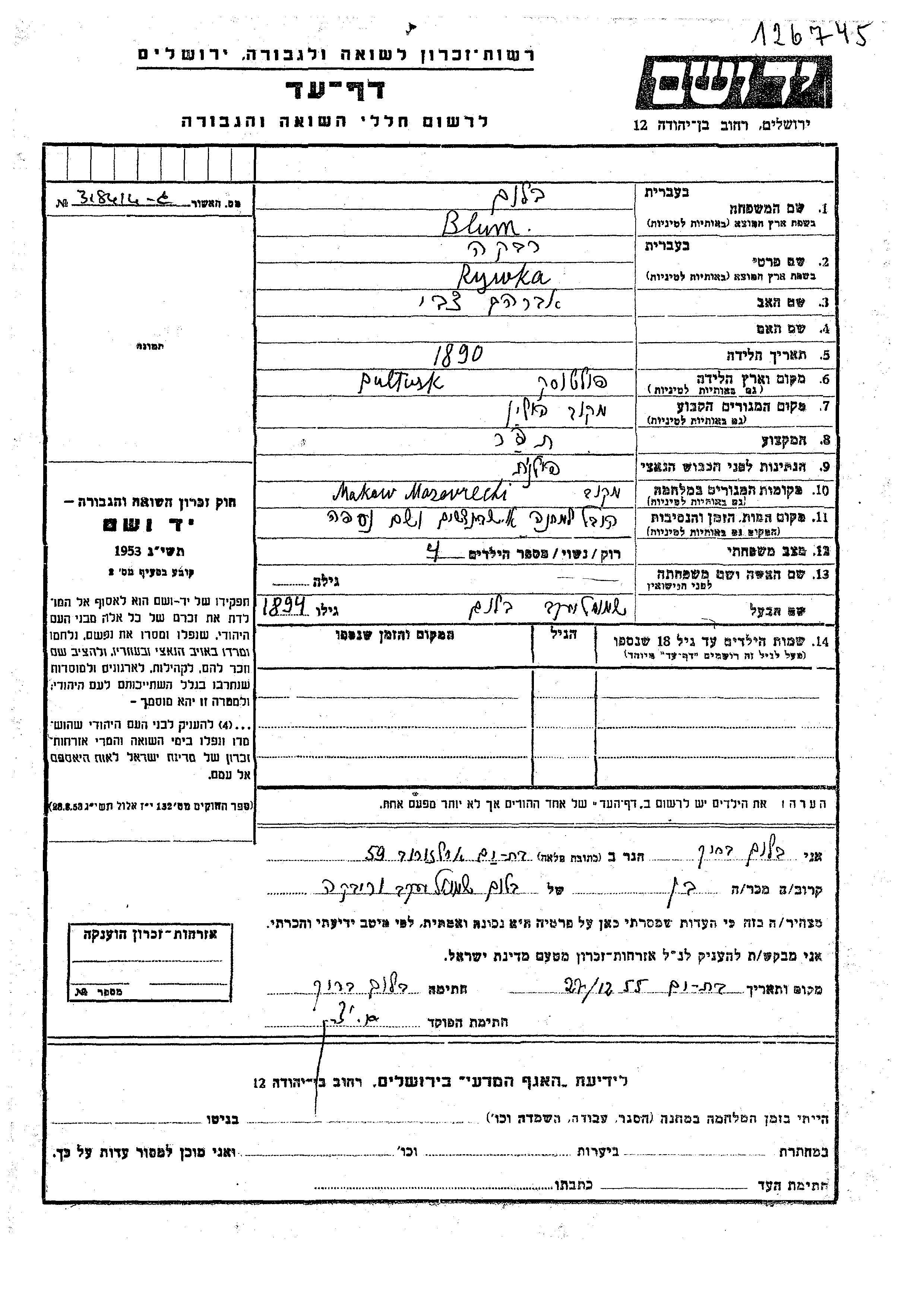 Rywka Blum wurde im Jahr 1890 in Pultusk, Polen geboren. Sie war die Tochter von Avraham Tzvi. Sie war Schneiderin und mit Shmuel Yaakov Verheiratet. Vor dem Zweiten Weltkrieg lebte sie in Makow, Polen. Während des Krieges war sie in Makow Mazowiecki, Polen.