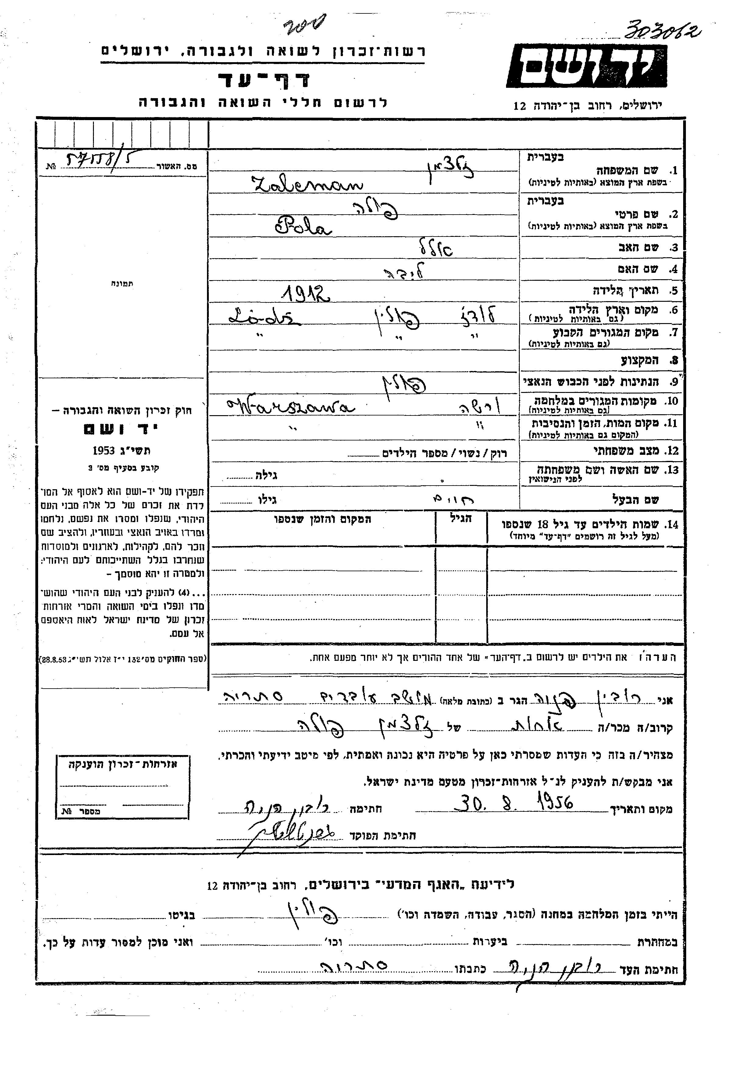 Pola Zalcman wurde im Jahr 1912 in Lodz, Polen geboren. Sie war die Tochter von Hilel und Liba. Vor dem Zweiten Weltkrieg lebte sie in Lodz, Polen. Während des Krieges war sie in Warszawa, Polen.
