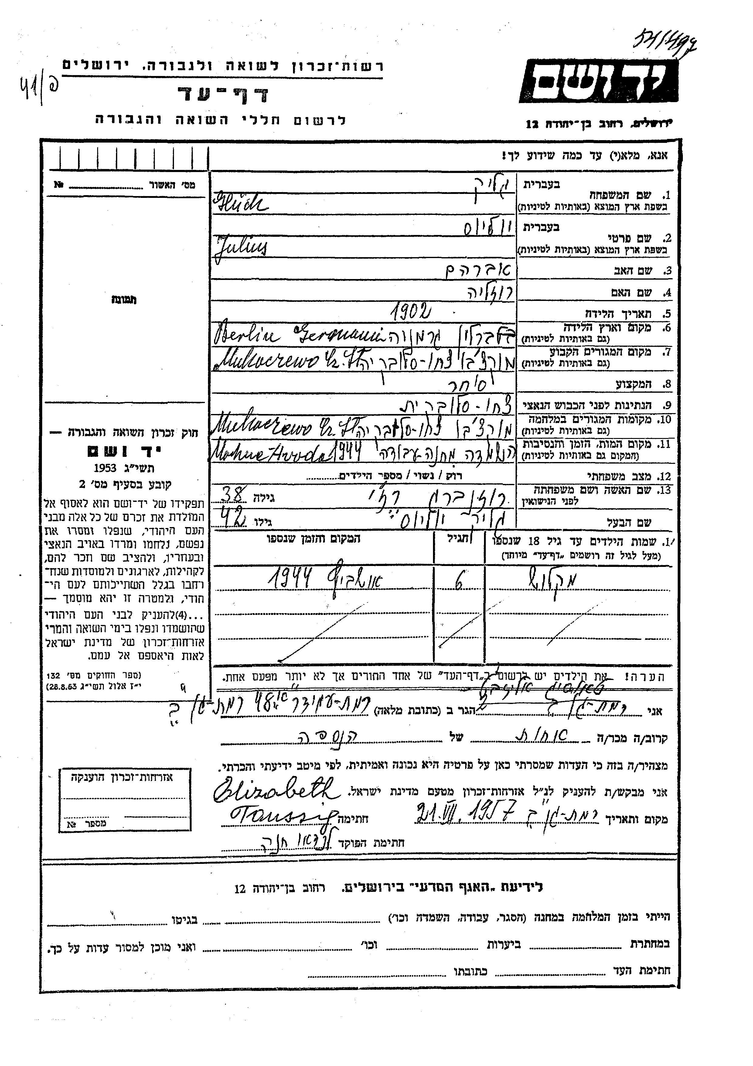 Yulius Glik wurde im Jahr 1902 in Berlin, Deutsches Reich geboren. Er war der Sohn von Avraham und Rozalia. Er war Kaufmann/-frau und mit Rezhi, geb. Rozenberg Verheiratet. Vor dem Zweiten Weltkrieg lebte er in Mukaczewo, Tschechoslowakei. Während des Krieges war er in Mukaczewo, Tschechoslowakei.