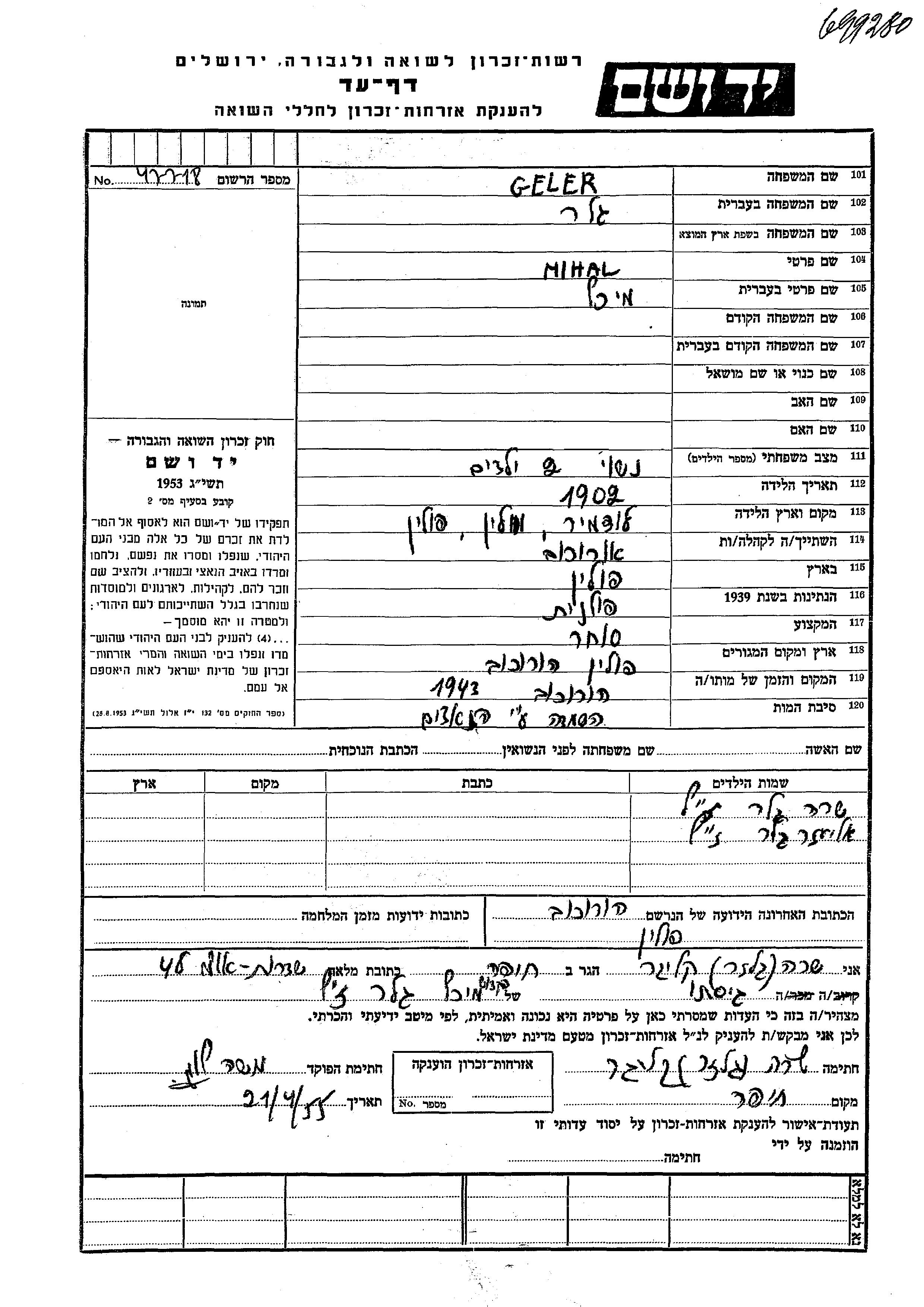 Mihal Mikhal Geler wurde im Jahr 1902 in Ludmir, Polen geboren. Er war Kaufmann/-frau und Verheiratet. Vor dem Zweiten Weltkrieg lebte er in Horochow, Polen.