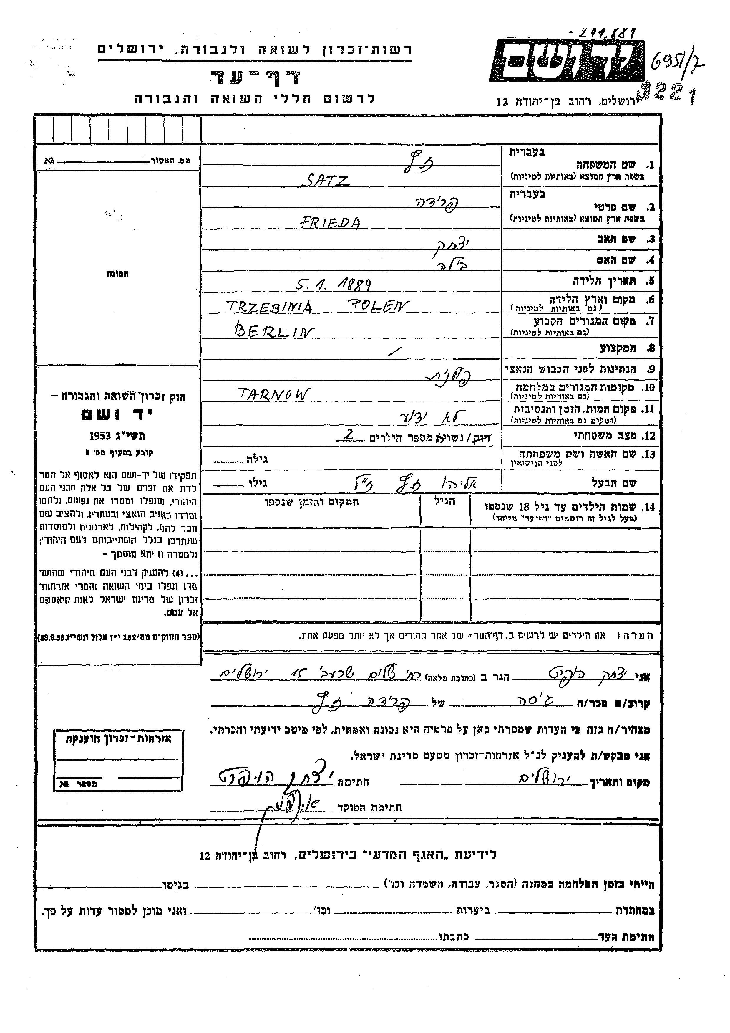 Frieda Satz Zetz wurde im Jahr 1889 in Trzebinia, Polen geboren. Sie war die Tochter von Yitzkhak und Bila. Sie war mit Eliahu Verheiratet. Vor dem Zweiten Weltkrieg lebte sie in Berlin, Deutsches Reich. Während des Krieges war sie in Tarnow, Polen.