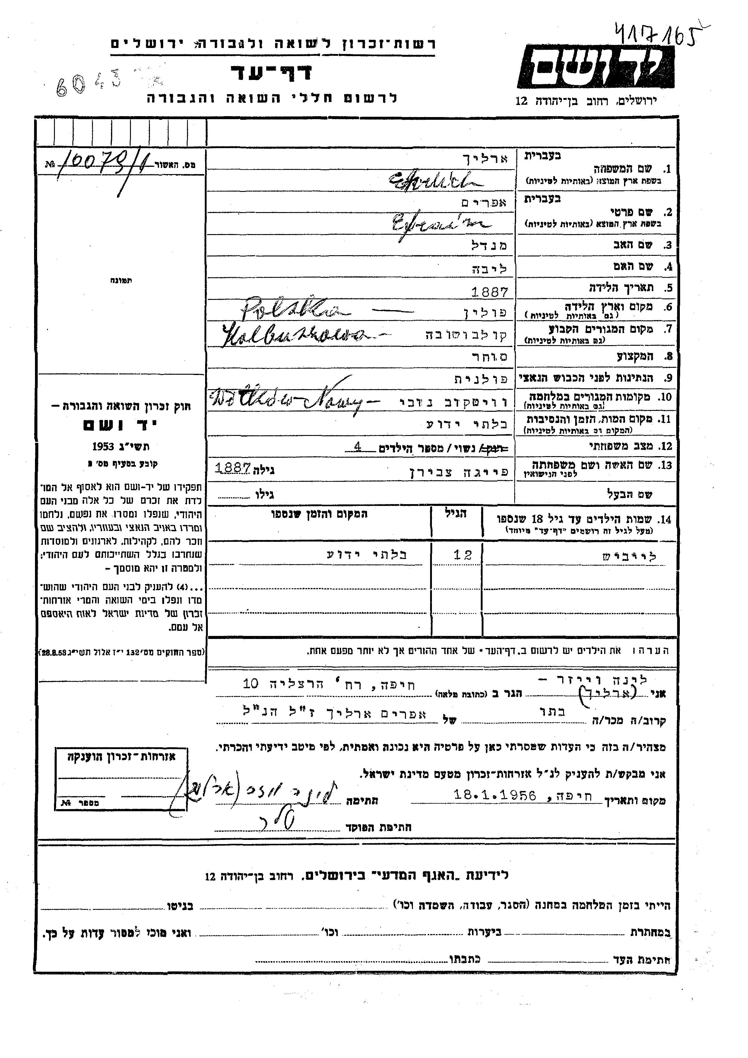 Efraim Ehrlich wurde im Jahr 1887 in Polen geboren. Er war der Sohn von Mendel und Liba. Er war Kaufmann/-frau und mit Feiga Verheiratet. Vor dem Zweiten Weltkrieg lebte er in Kolbuszowa, Polen. Während des Krieges war er in Witkow Nowy, Polen.