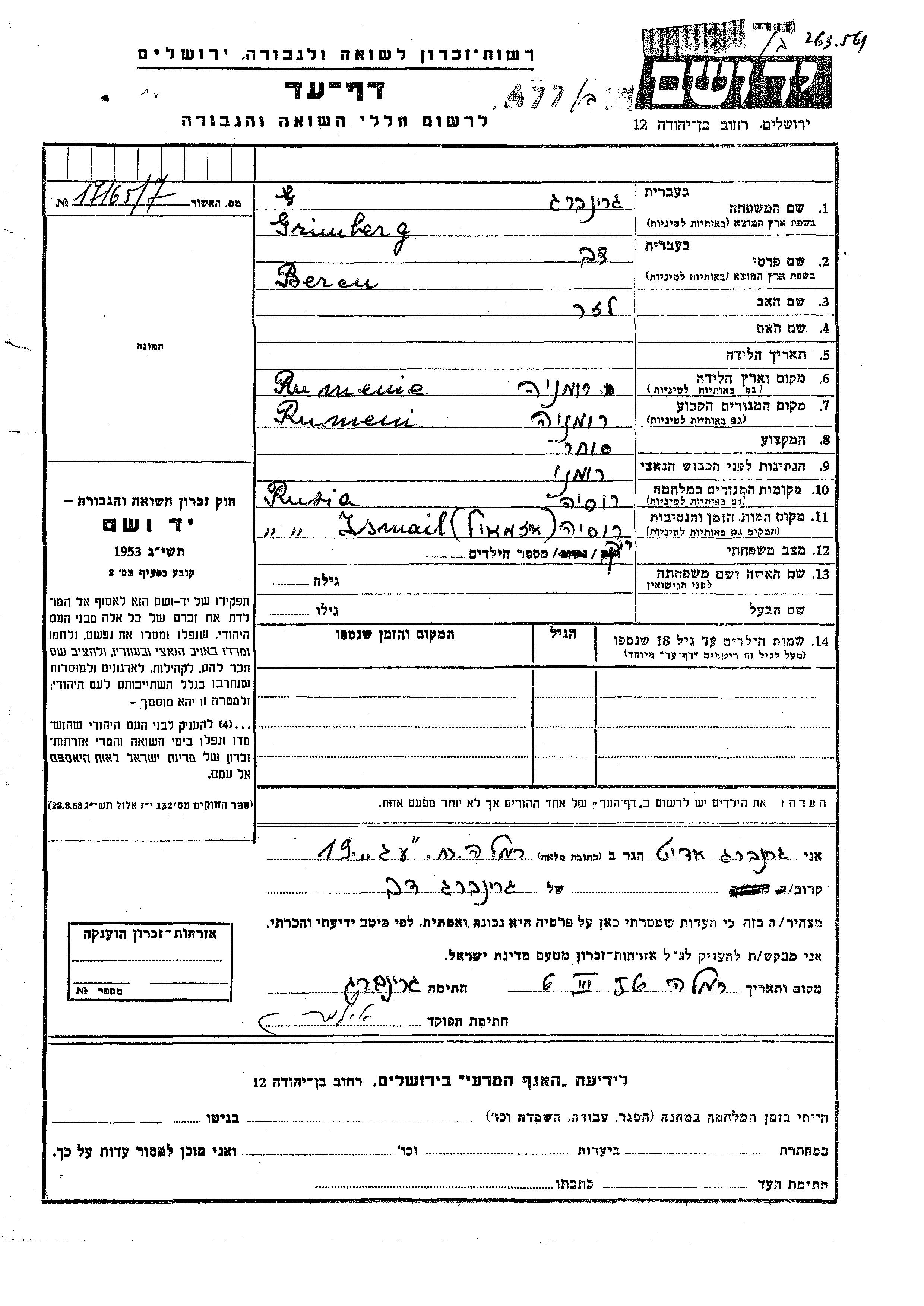 Grinberg Bercu Dov Rumänien Gedenkblatt