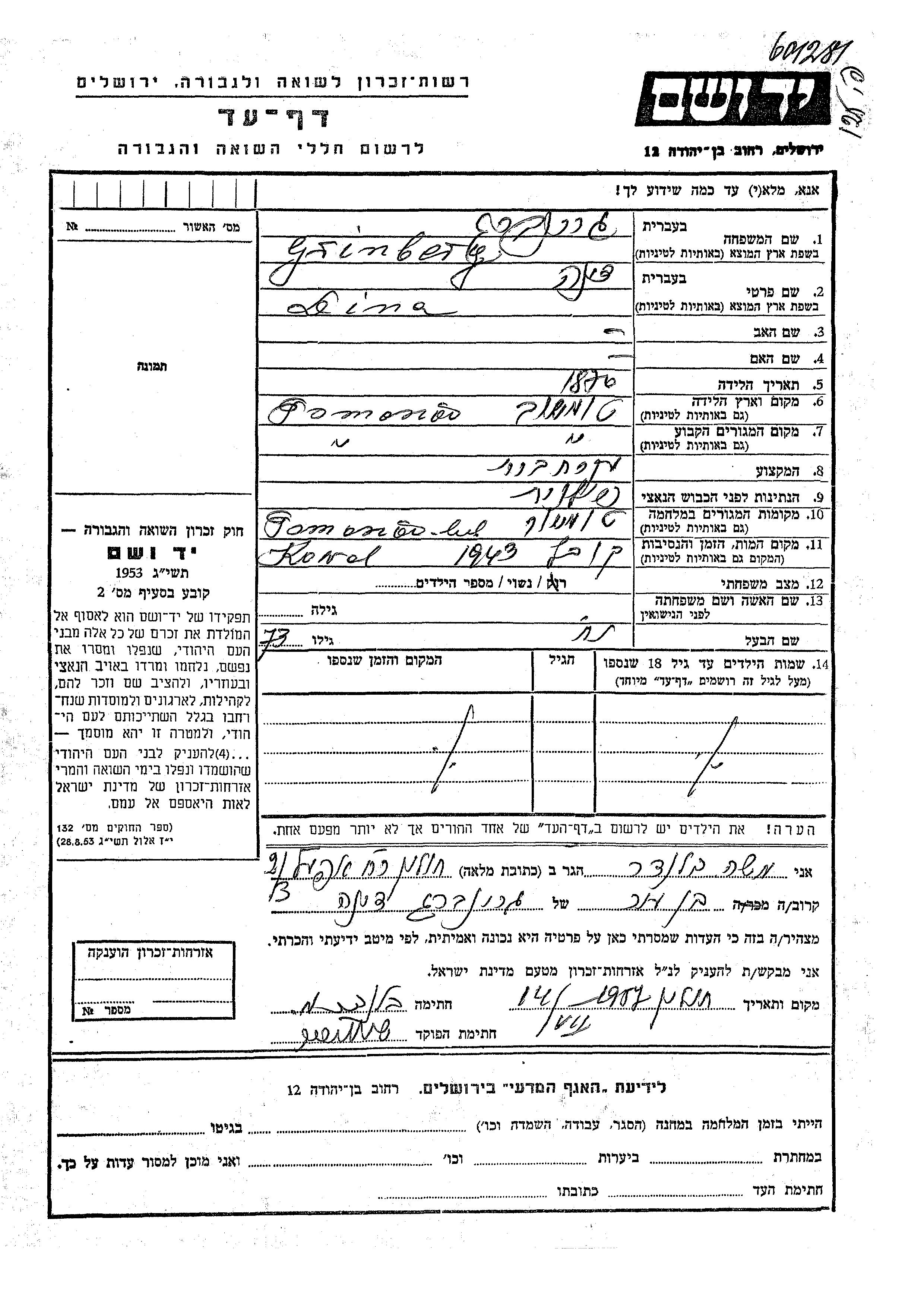 Dina Grinberg wurde im Jahr 1870 in Tomaszow Lubelski, Polen geboren. Sie war Hausfrau und mit Noakh Verheiratet. Vor dem Zweiten Weltkrieg lebte sie in Tomaszow Lubelski, Polen. Während des Krieges war sie in Tomaszow Lubelski, Polen.