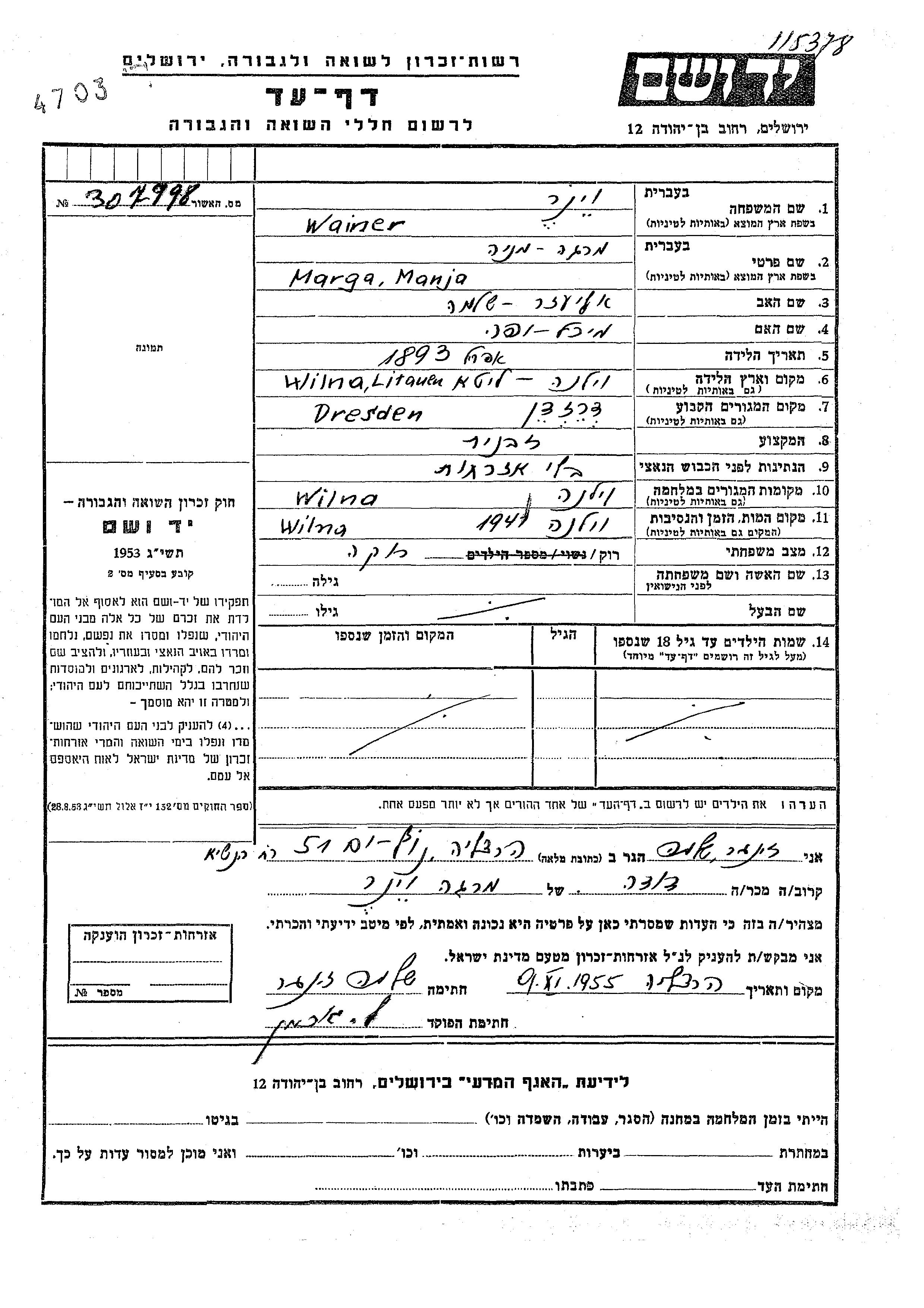 Manja Marga Wainer Viner wurde im Jahr 1893 in Wilna, Polen geboren. Sie war die Tochter von Eliezer Shlomo und Mikhal Yafa. Sie war Verkäufer/-in und Ledig. Vor dem Zweiten Weltkrieg lebte sie in Dresden, Deutsches Reich. Während des Krieges war sie in Wilna, Polen.