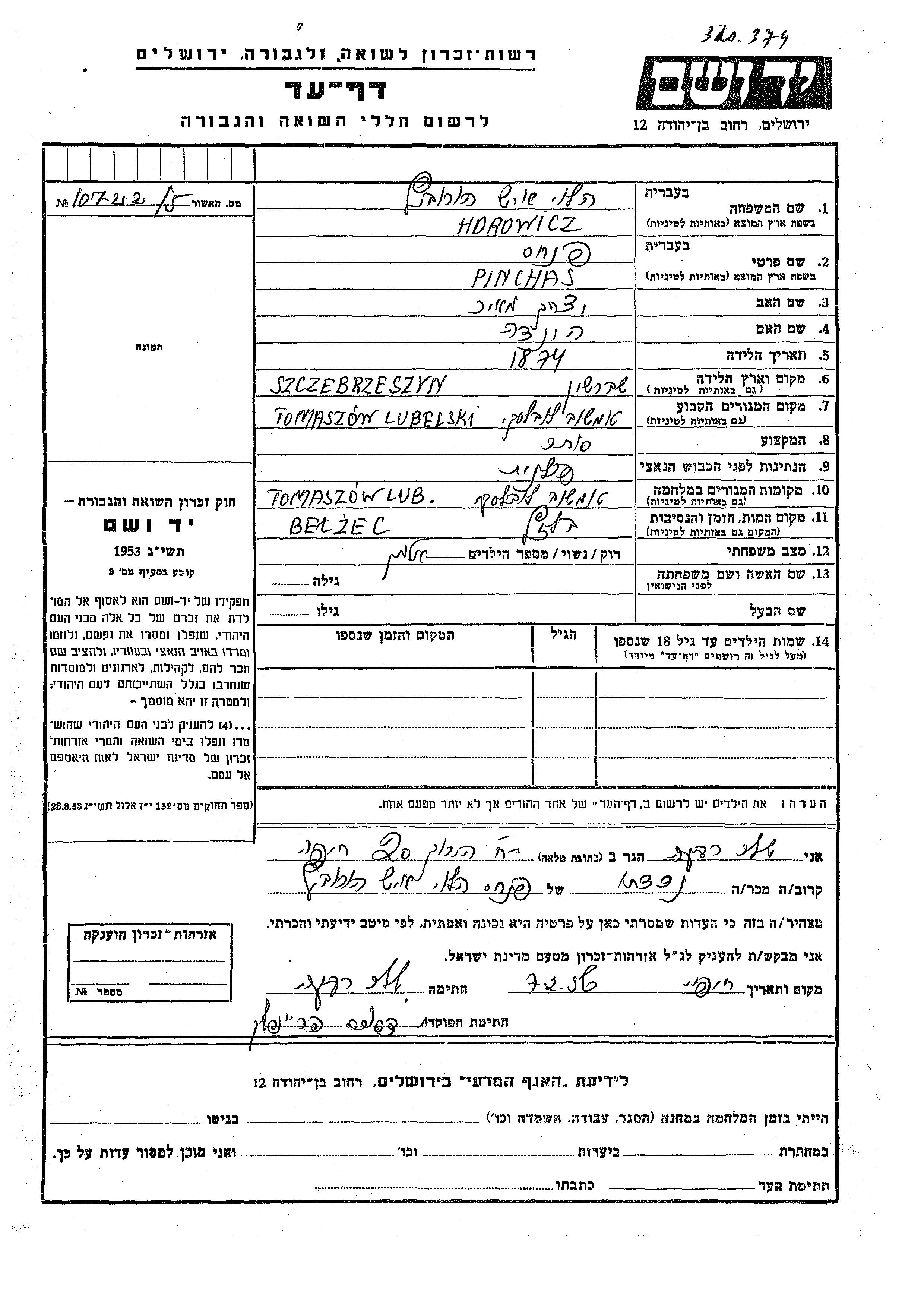 Pinchas Horowicz Halevi wurde im Jahr 1874 in Szczebrzeszyn, Polen geboren. Er war der Sohn von Yitzkhak Meir und Hinda. Er war Kaufmann/-frau und Witwer. Vor dem Zweiten Weltkrieg lebte er in Tomaszow Lubelski, Polen. Während des Krieges war er in Tomaszow Lubelski, Polen.