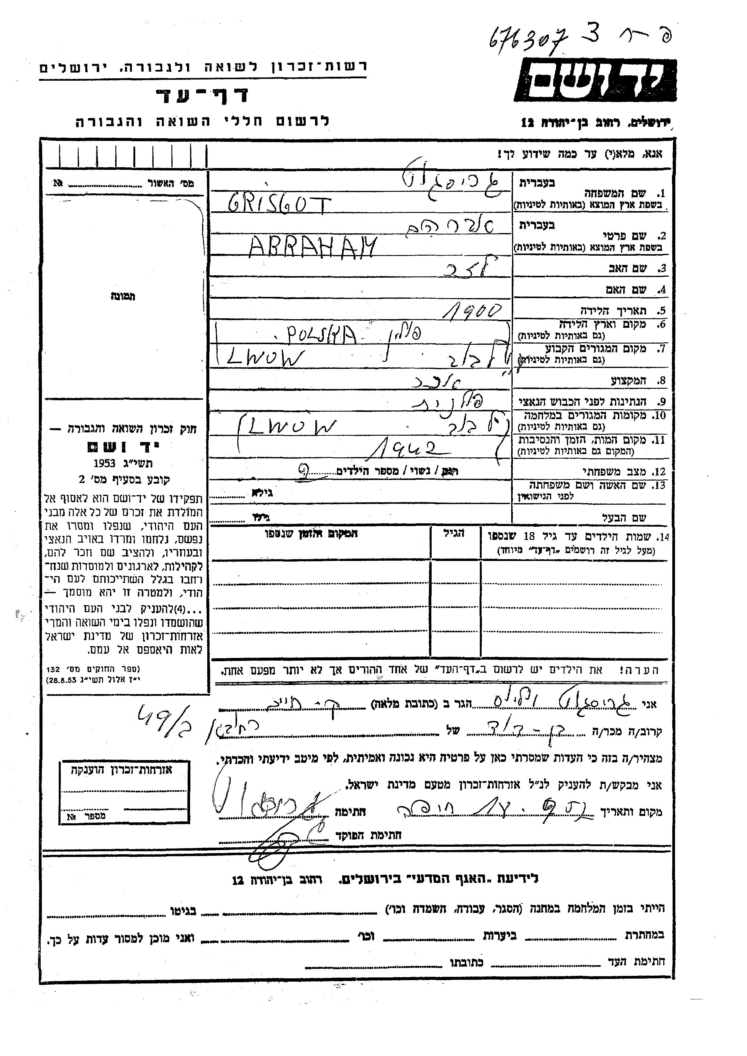 Abraham wurde in der Schoah ermordet. Todesort: Lwow, Polen im Jahr 1942.