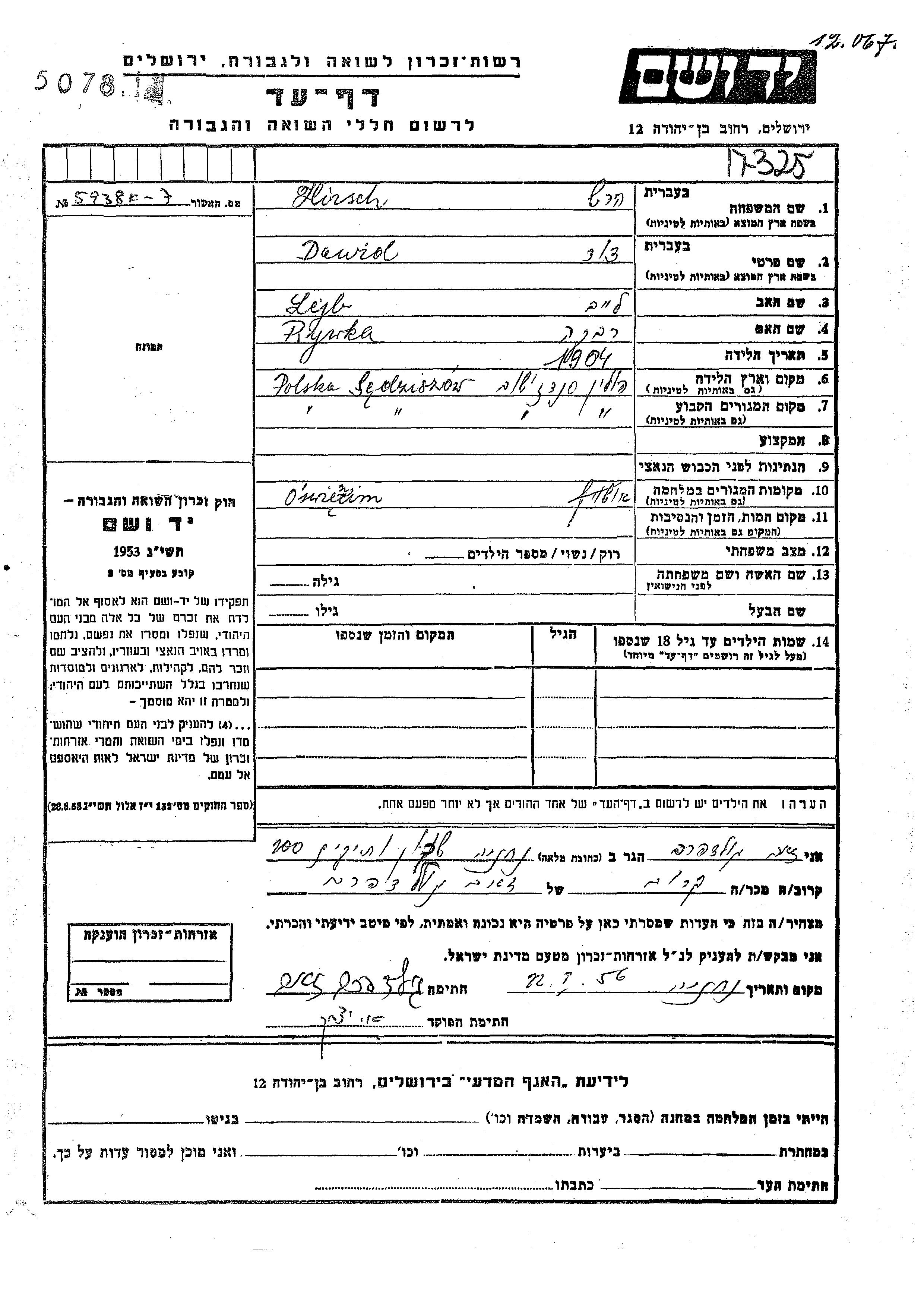 David Hirsch wurde im Jahr 1904 in Sendiszow, Polen geboren. Er war der Sohn von Lejb und Rywka. Vor dem Zweiten Weltkrieg lebte er in Sendiszow, Polen. Während des Krieges war er in Auschwitz, Polen.