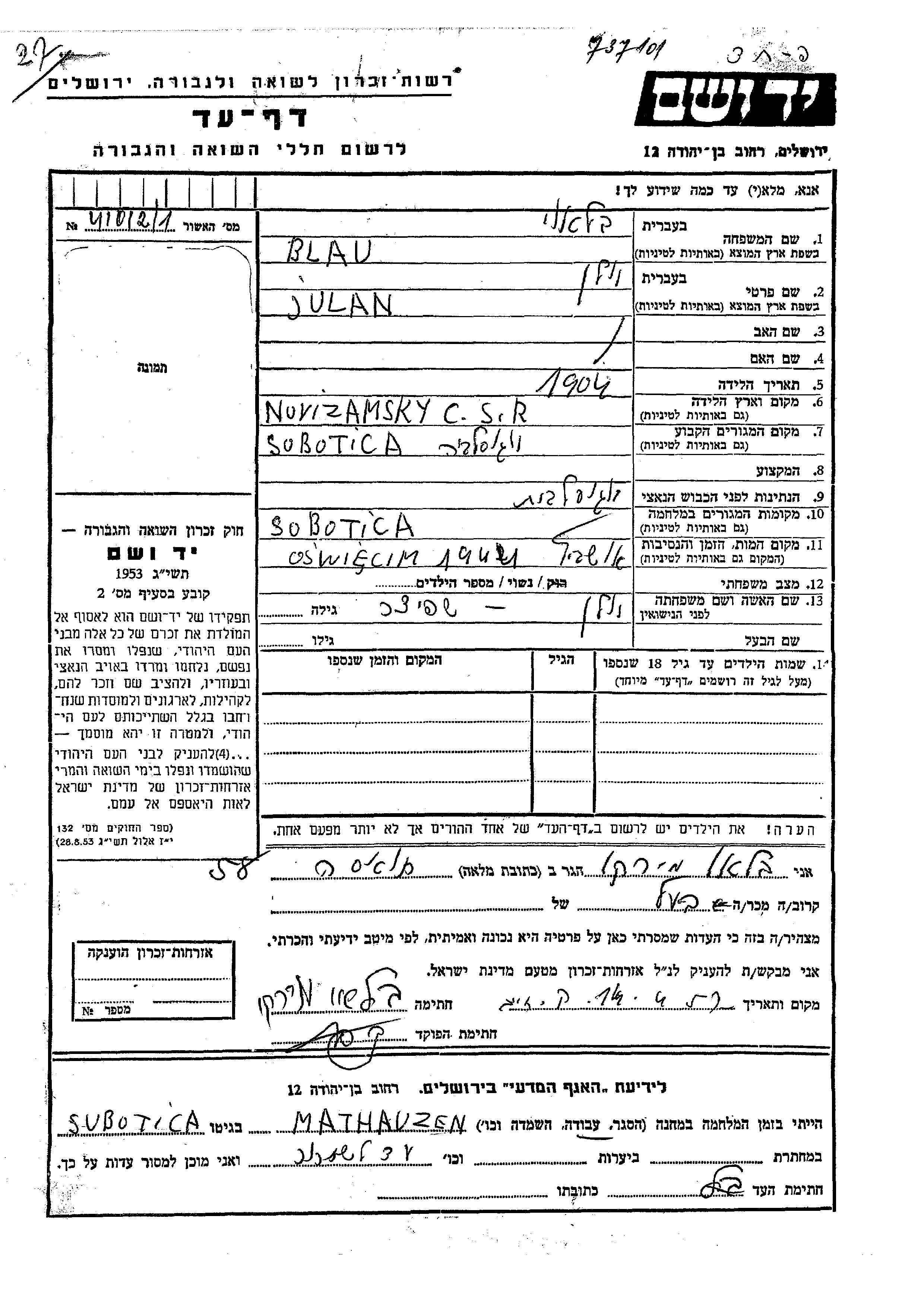 Julan Blau, geb. Shpitzer wurde im Jahr 1904 in Nove Zamky, Tschechoslowakei geboren. Sie war mit Mirko Verheiratet. Vor dem Zweiten Weltkrieg lebte sie in Subotica, Jugoslawien. Während des Krieges war sie in Subotica, Jugoslawien.