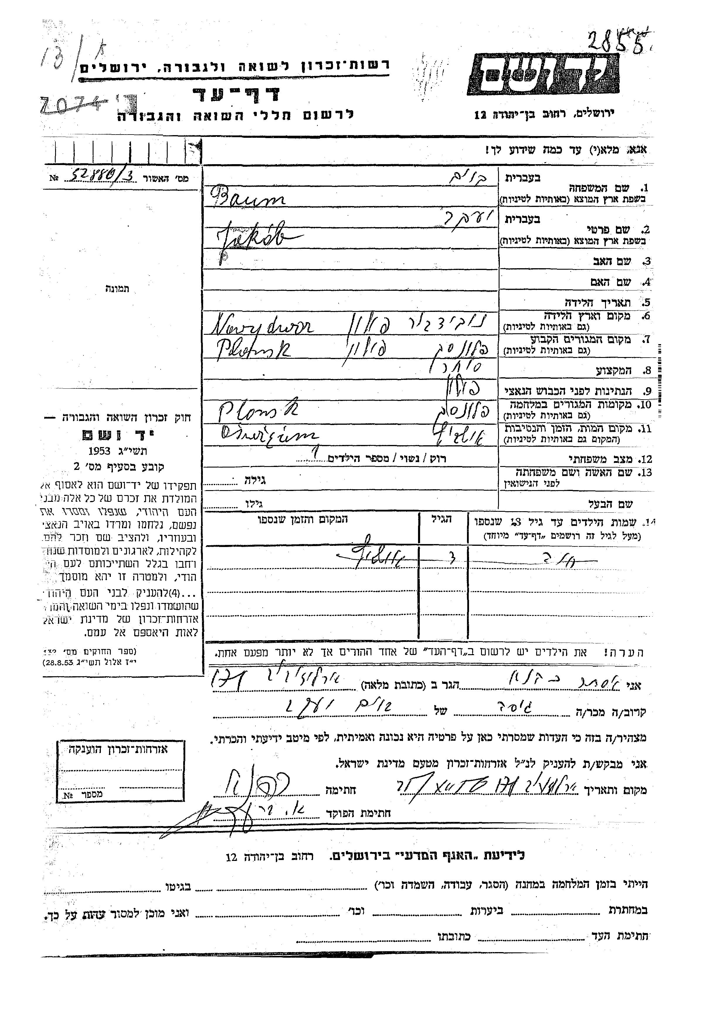 Yakob Baum wurde in Novy Dvor, Polen geboren. Er war Kaufmann/-frau und Verheiratet. Vor dem Zweiten Weltkrieg lebte er in Plonsk, Polen. Während des Krieges war er in Plonsk, Polen.