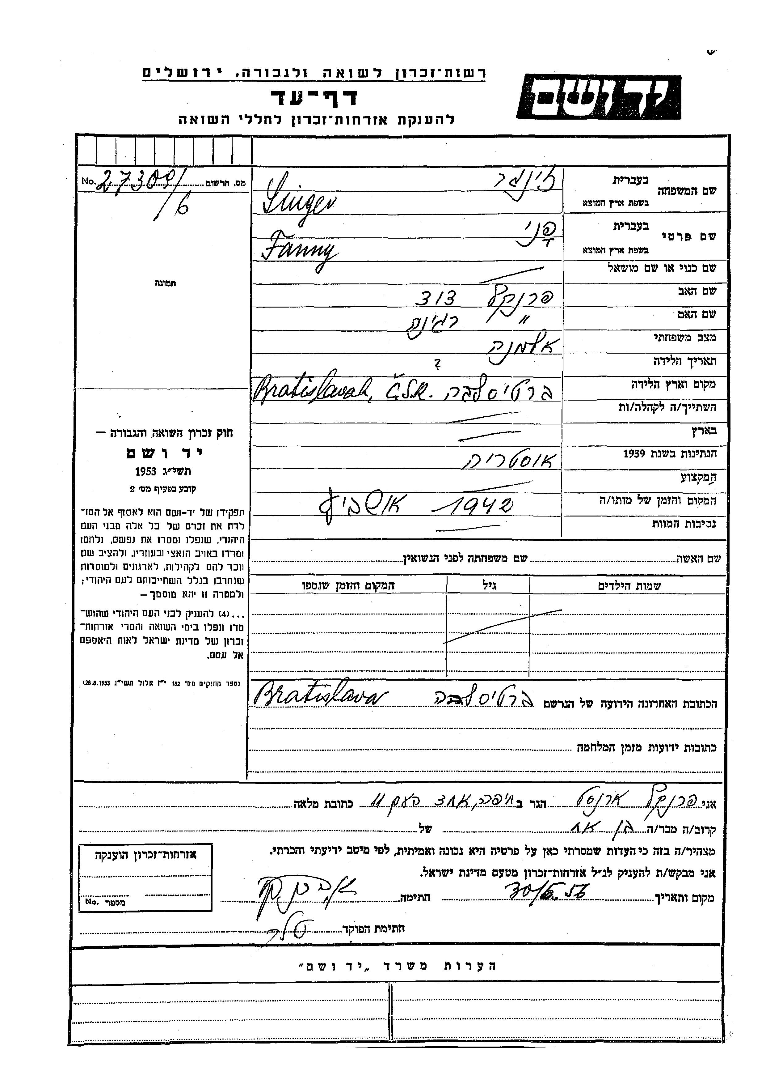 Fanny Singer, geb. Frenkel wurde in Bratislava, Tschechoslowakei geboren. Sie war die Tochter von David und Regina. Sie war Witwe.