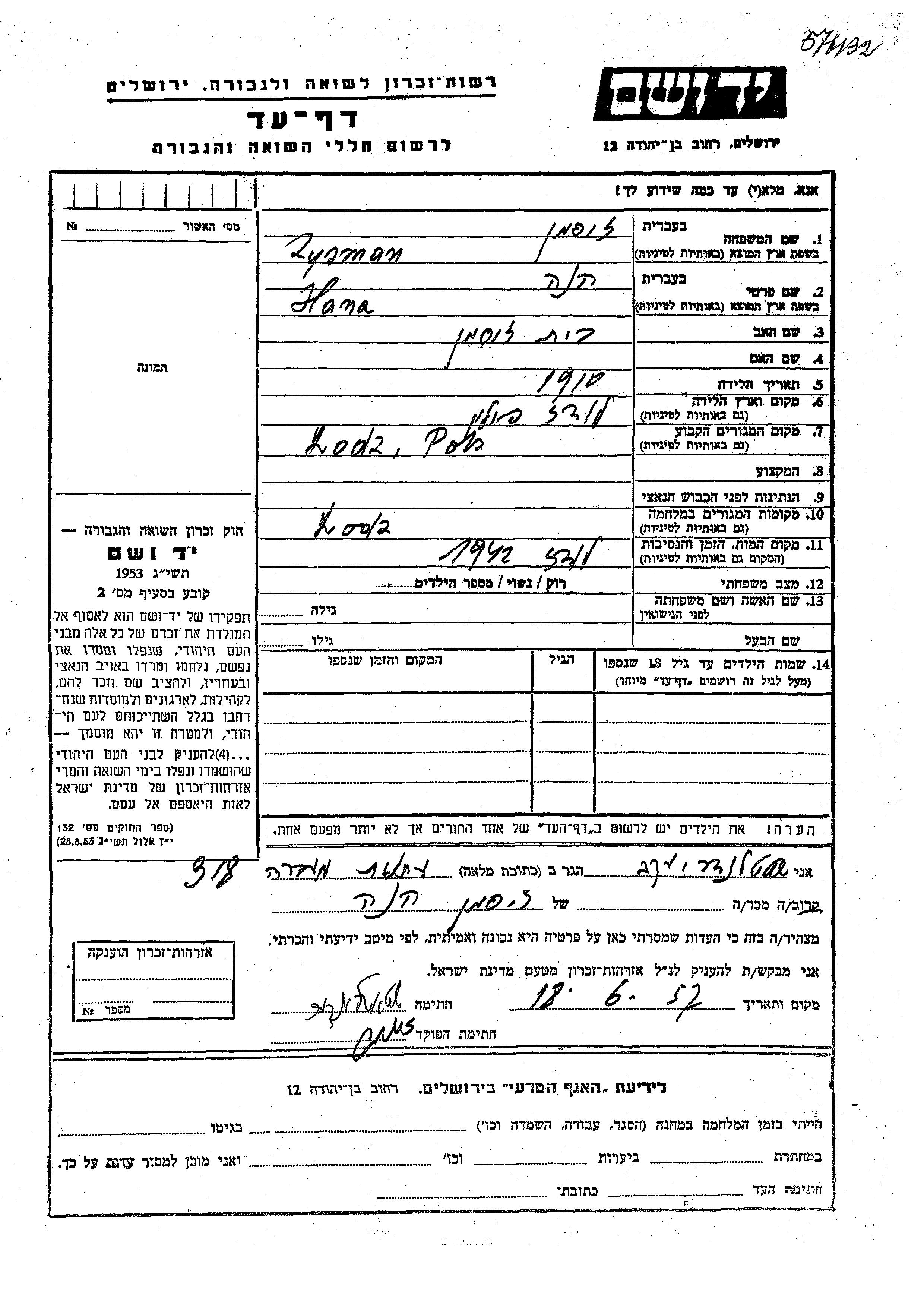 Hana Zysman, geb. Zisman wurde im Jahr 1910 in Lodz, Polen geboren. Vor dem Zweiten Weltkrieg lebte sie in Lodz, Polen. Während des Krieges war sie in Lodz, Polen.