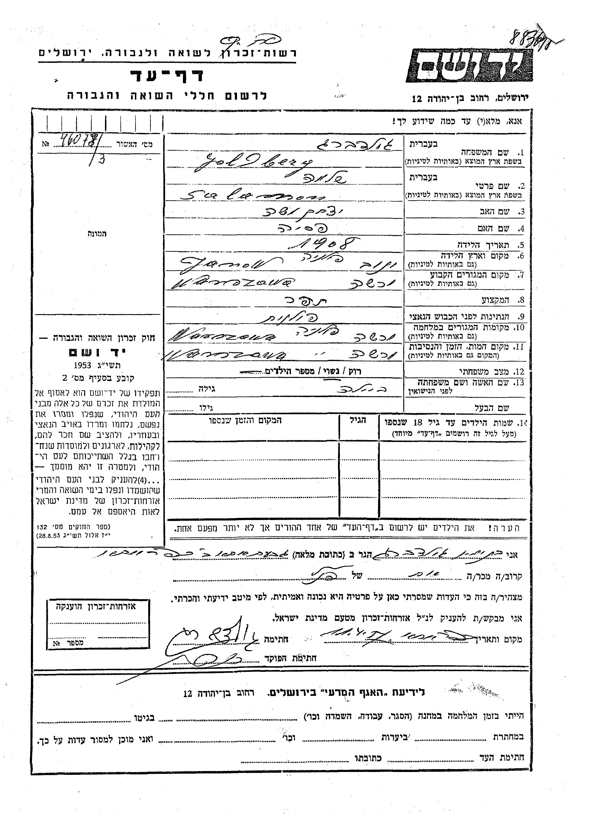 Salomon Goldberg wurde im Jahr 1908 in Janow, Polen geboren. Er war der Sohn von Yitzkhak Moshe und Pesia. Er war Näher und mit Beila Verheiratet. Vor dem Zweiten Weltkrieg lebte er in Warszawa, Polen. Während des Krieges war er in Warszawa, Polen.