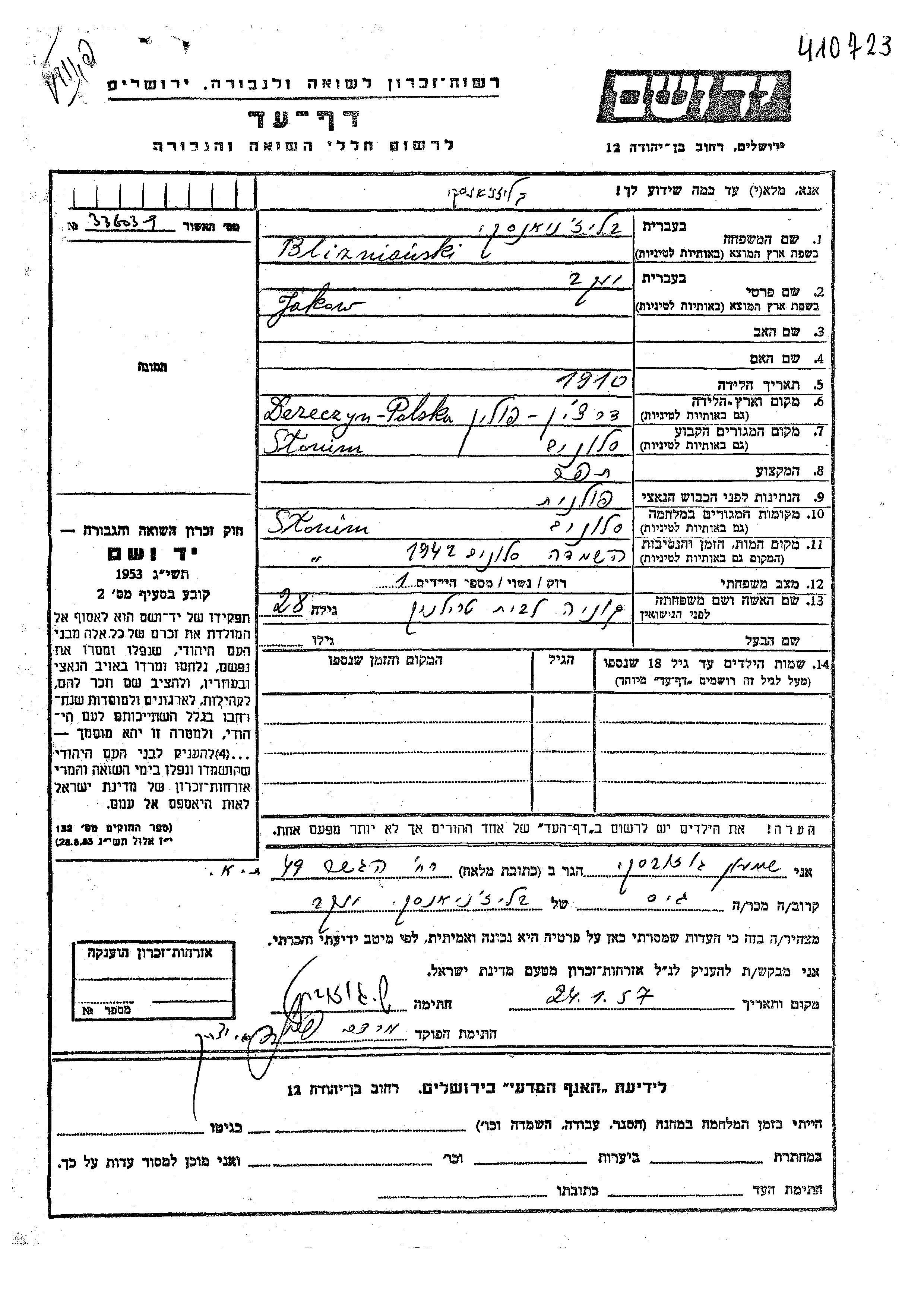 Jakov Bliznianski wurde im Jahr 1910 in Dereczyn, Polen geboren. Er war תופר טליתות und mit Kunia, geb. Trilnik Verheiratet. Vor dem Zweiten Weltkrieg lebte er in Slonim, Polen. Während des Krieges war er in Slonim, Polen.