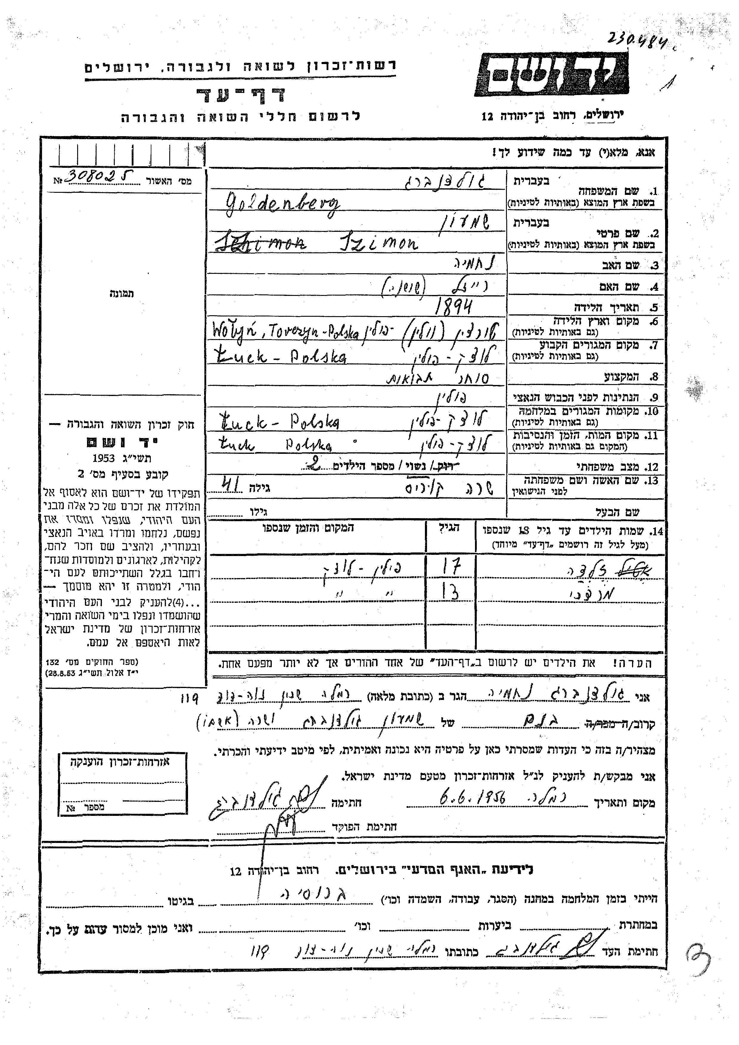 Szimon Goldenberg wurde im Jahr 1894 in Torczyn, Polen geboren. Er war der Sohn von Nekhemia und Reizl Shoshana. Er war Getreidehändler/-in und mit Sara, geb. Kuris Verheiratet. Vor dem Zweiten Weltkrieg lebte er in Luck, Polen. Während des Krieges war er in Luck, Polen.