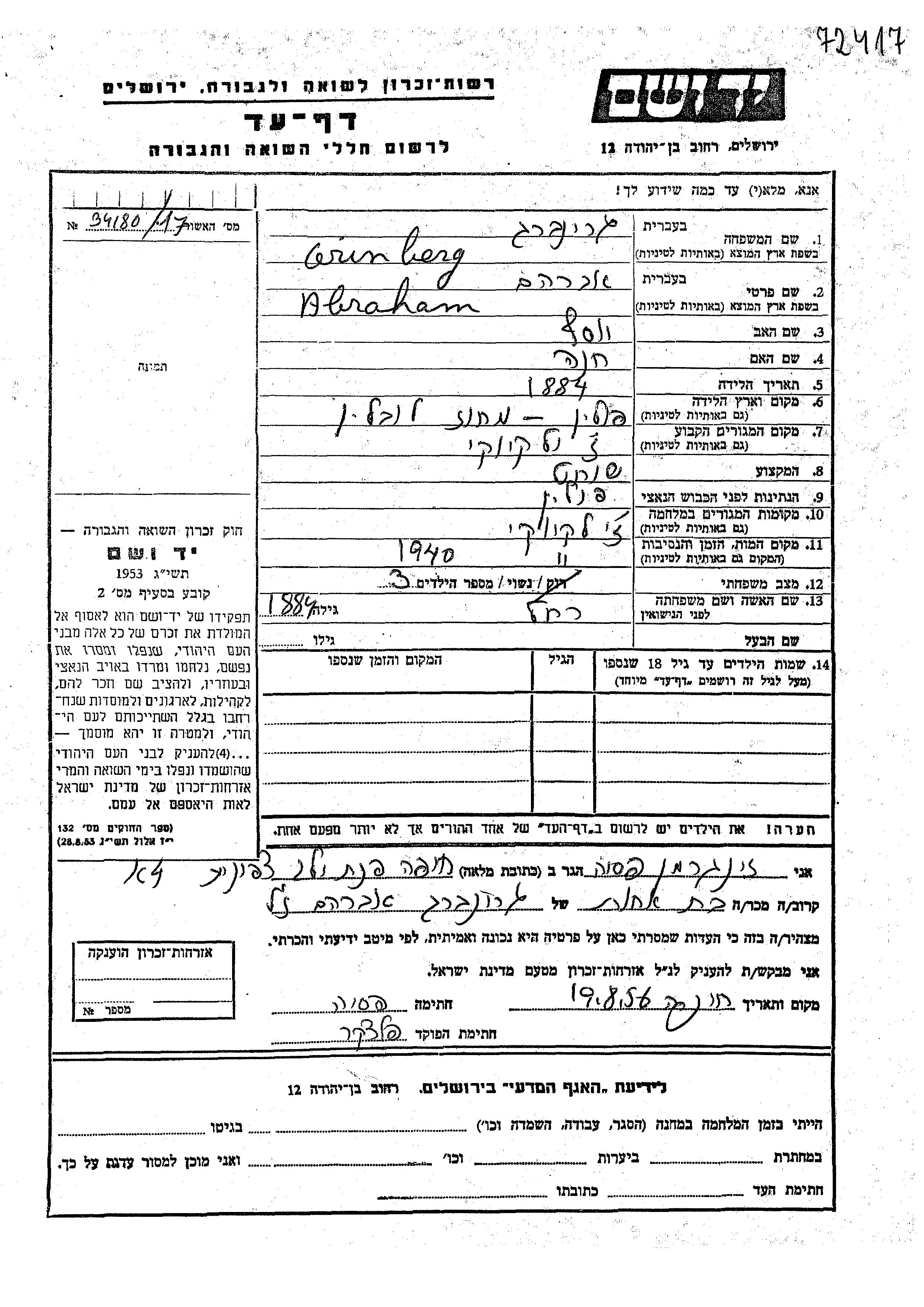 Abraham Grinberg wurde im Jahr 1884 in Lublin, Polen geboren. Er war der Sohn von Yosef und Khana. Er war Schächter und mit Rakhel Verheiratet. Vor dem Zweiten Weltkrieg lebte er in Zolkiewka, Polen. Während des Krieges war er in Zolkiewka, Polen.