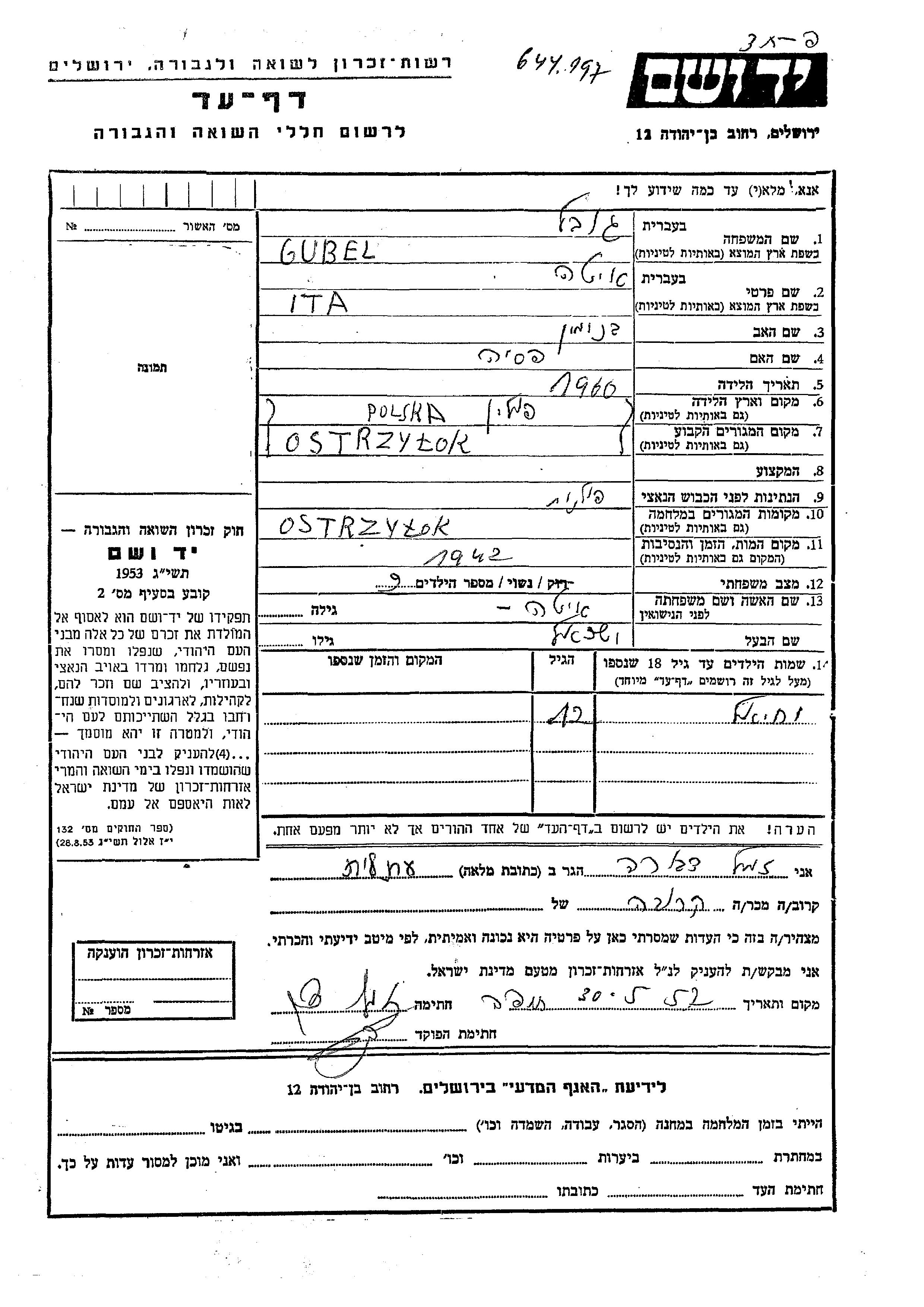 Ita Gubel wurde im Jahr 1900 in Polen geboren. Sie war die Tochter von Beniamin und Pesia. Sie war mit Yisrael Verheiratet. Vor dem Zweiten Weltkrieg lebte sie in Uscilug, Polen. Während des Krieges war sie in Uscilug, Polen.