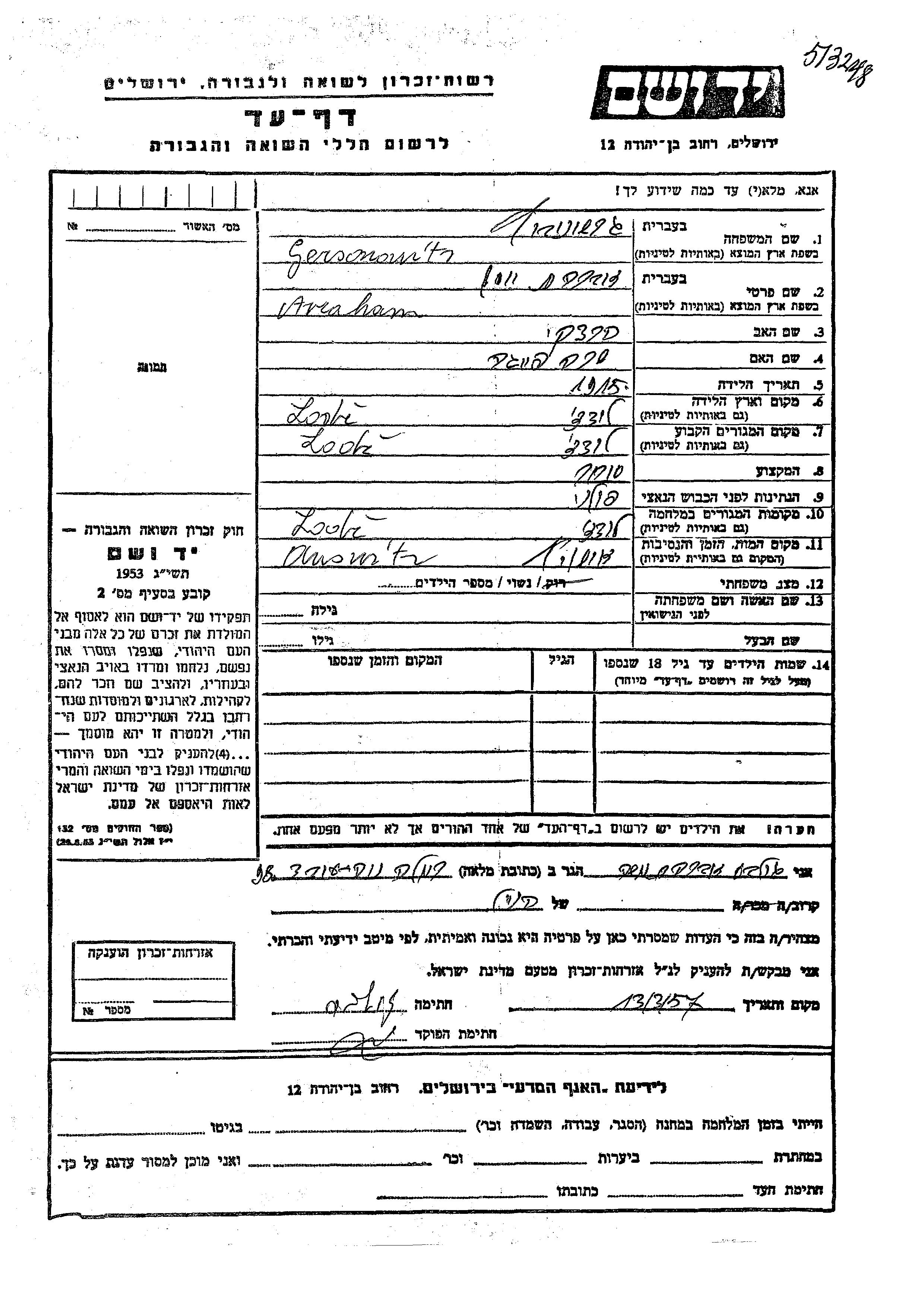 Gersonovitz Avraham Yosef 1915 Lodz, Polen Gedenkblatt