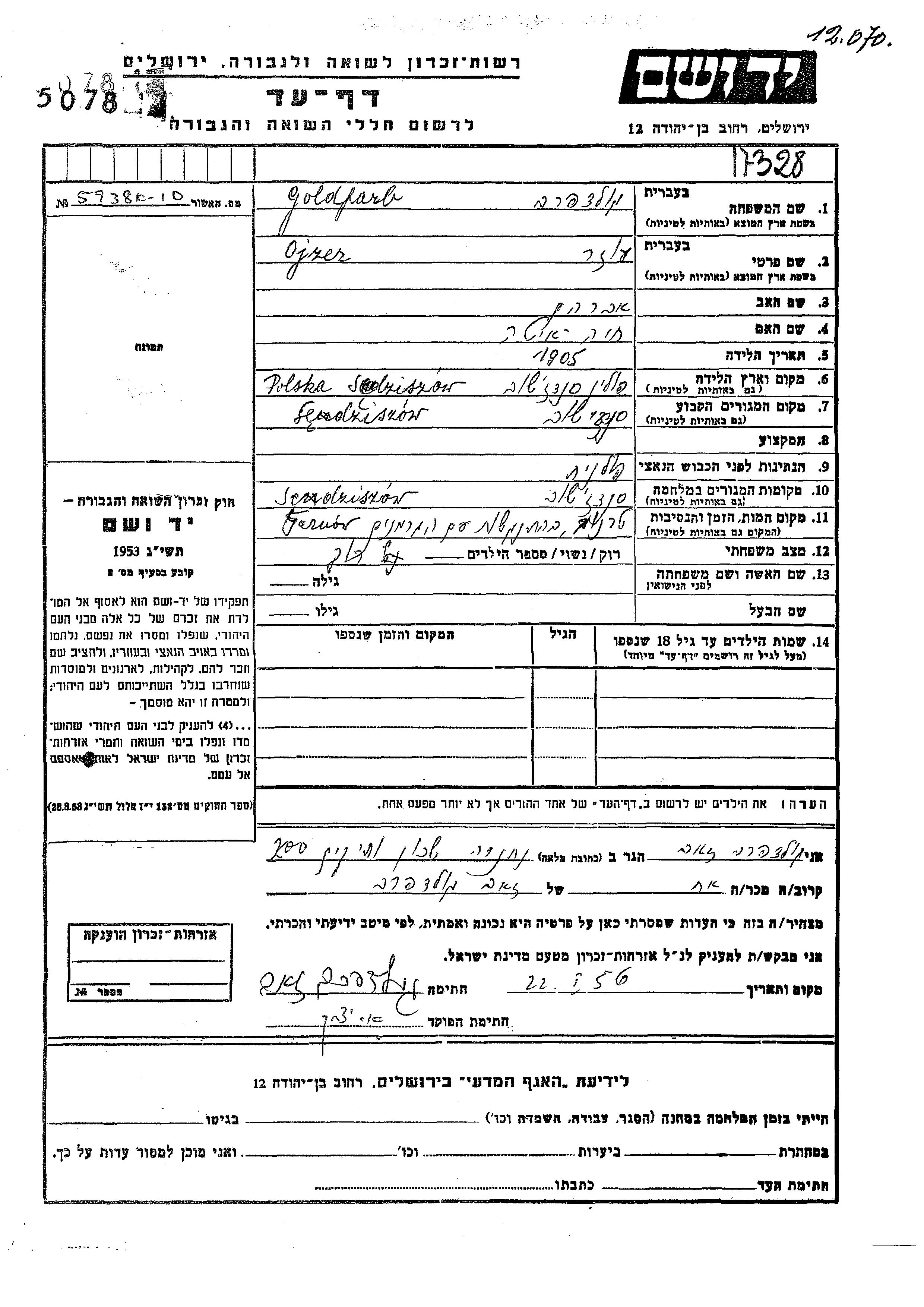 Ojzer Goldfarb wurde im Jahr 1905 in Sendziszov, Polen geboren. Er war der Sohn von Avraham und Khaia Ita. Er war Ledig. Vor dem Zweiten Weltkrieg lebte er in Sendziszov, Polen. Während des Krieges war er in Sendziszov, Polen.