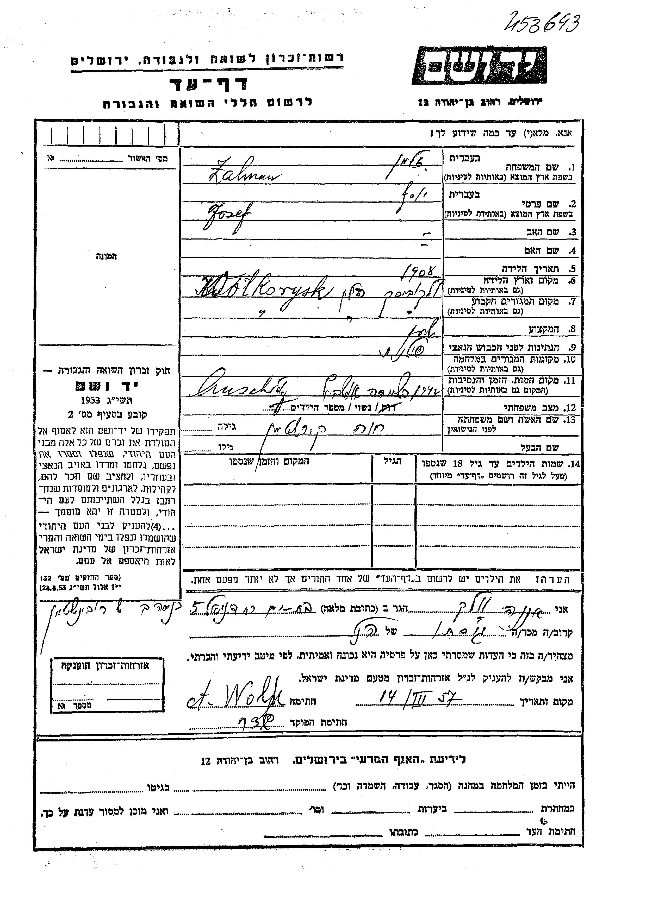 Zalman Josef 1908 Wolkowysk, Polen Gedenkblatt