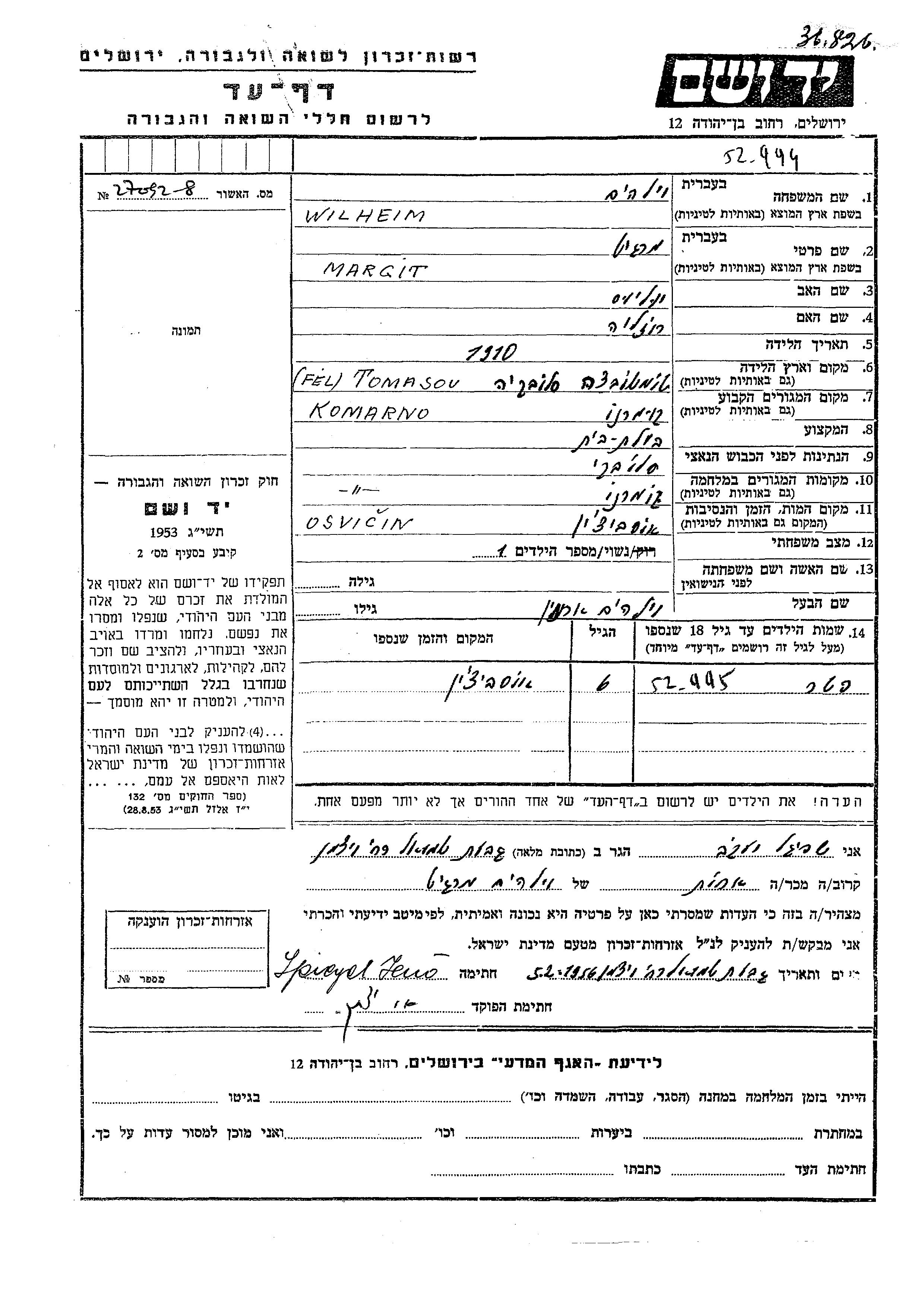 Margit Wilheim wurde im Jahr 1910 in Tomasov, Tschechoslowakei geboren. Sie war die Tochter von Yulius und Rozalia. Sie war Hausfrau und mit Armin Verheiratet. Vor dem Zweiten Weltkrieg lebte sie in Komarno, Tschechoslowakei. Während des Krieges war sie in Komarno, Tschechoslowakei.