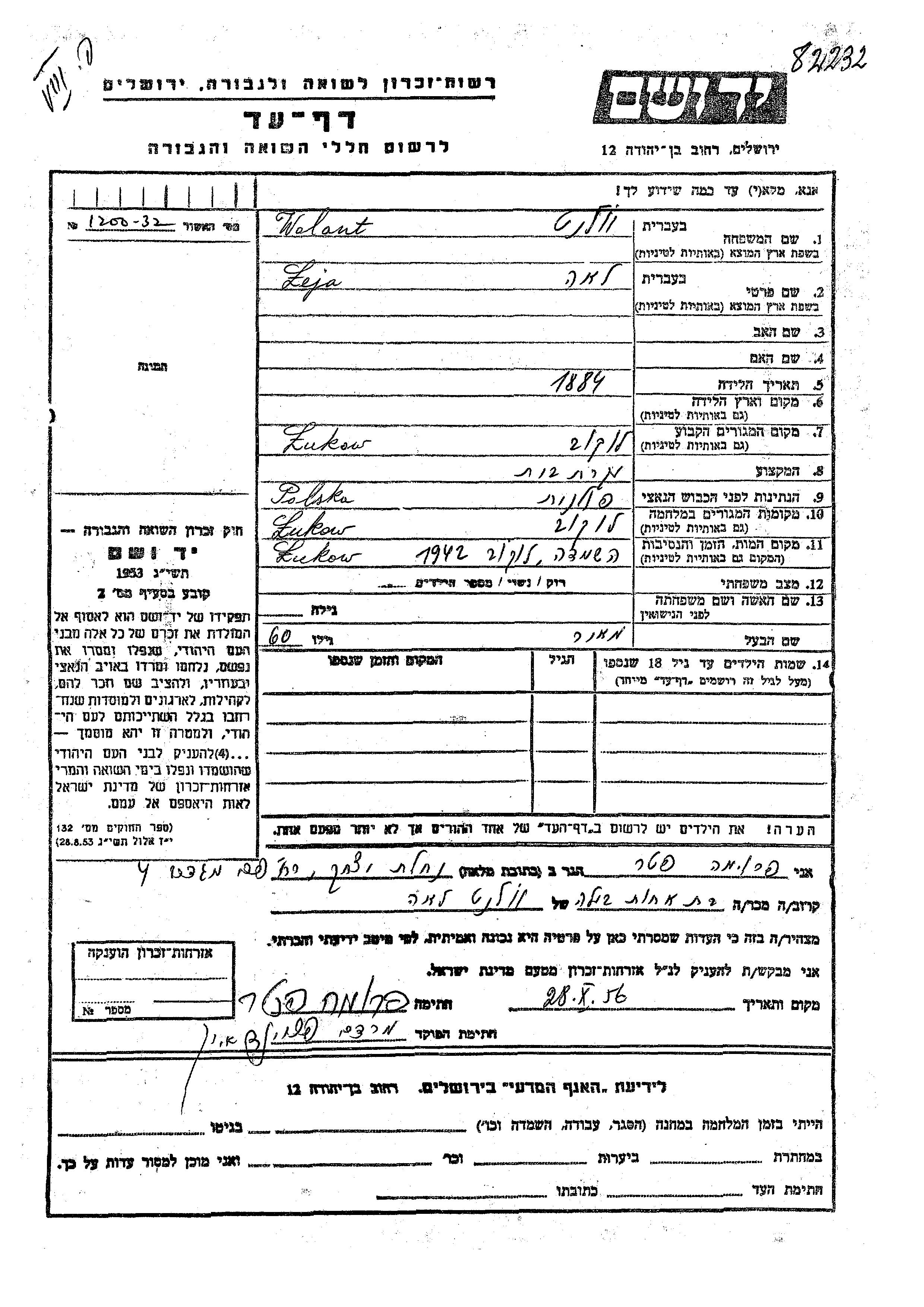 Leja Wolant wurde im Jahr 1884 geboren. Sie war Hausfrau und mit Meir Verheiratet. Vor dem Zweiten Weltkrieg lebte sie in Lukow, Polen. Während des Krieges war sie in Lukow, Polen.