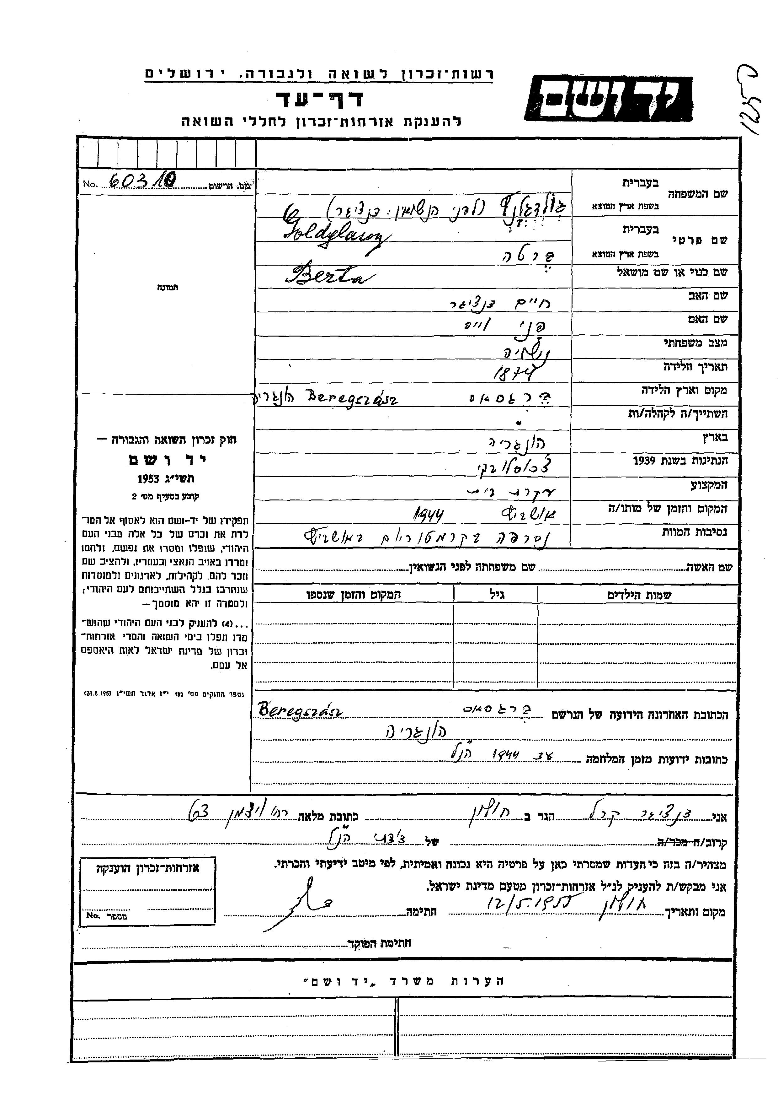Berta Goldglanz, geb. Danziger wurde im Jahr 1874 in Beregszasz, Tschechoslowakei geboren. Sie war die Tochter von Khaim und Fani. Sie war Hausfrau und Verheiratet. Vor dem Zweiten Weltkrieg lebte sie in Beregszasz, Tschechoslowakei. Während des Krieges war sie in Beregszasz, Tschechoslowakei.