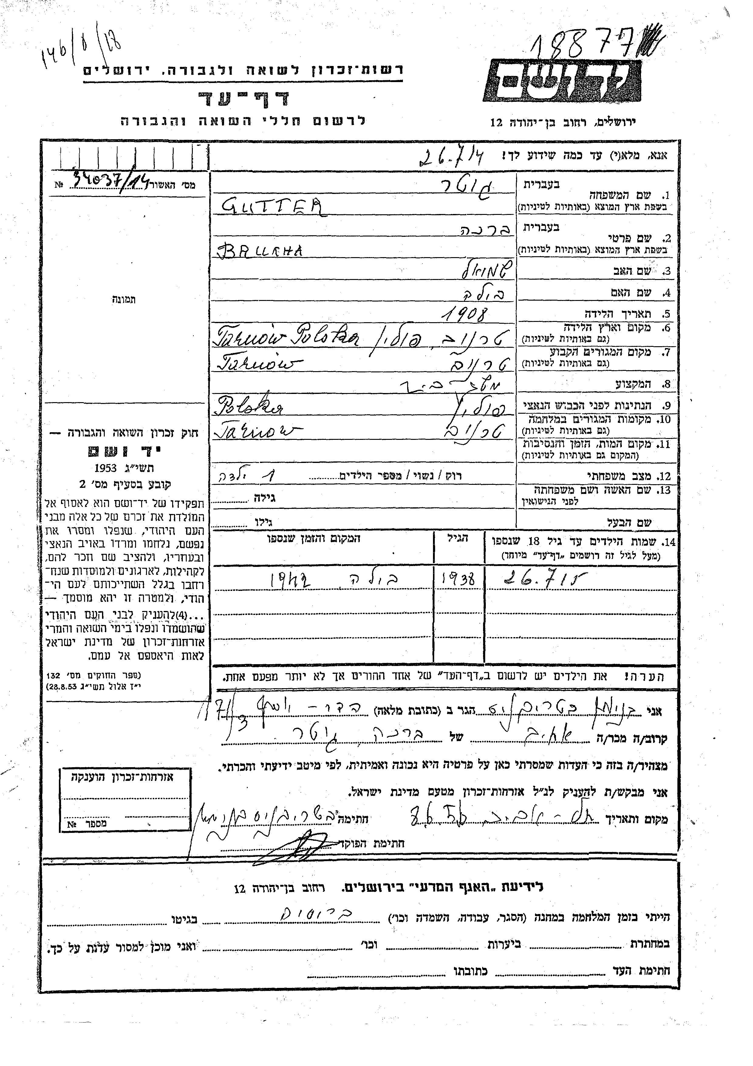 Brukha Gutter wurde im Jahr 1908 in Tarnow, Polen geboren. Sie war die Tochter von Shmuel und Bila. Sie war Haushaltshilfe und Verheiratet. Vor dem Zweiten Weltkrieg lebte sie in Tarnow, Polen. Während des Krieges war sie in Tarnow, Polen.