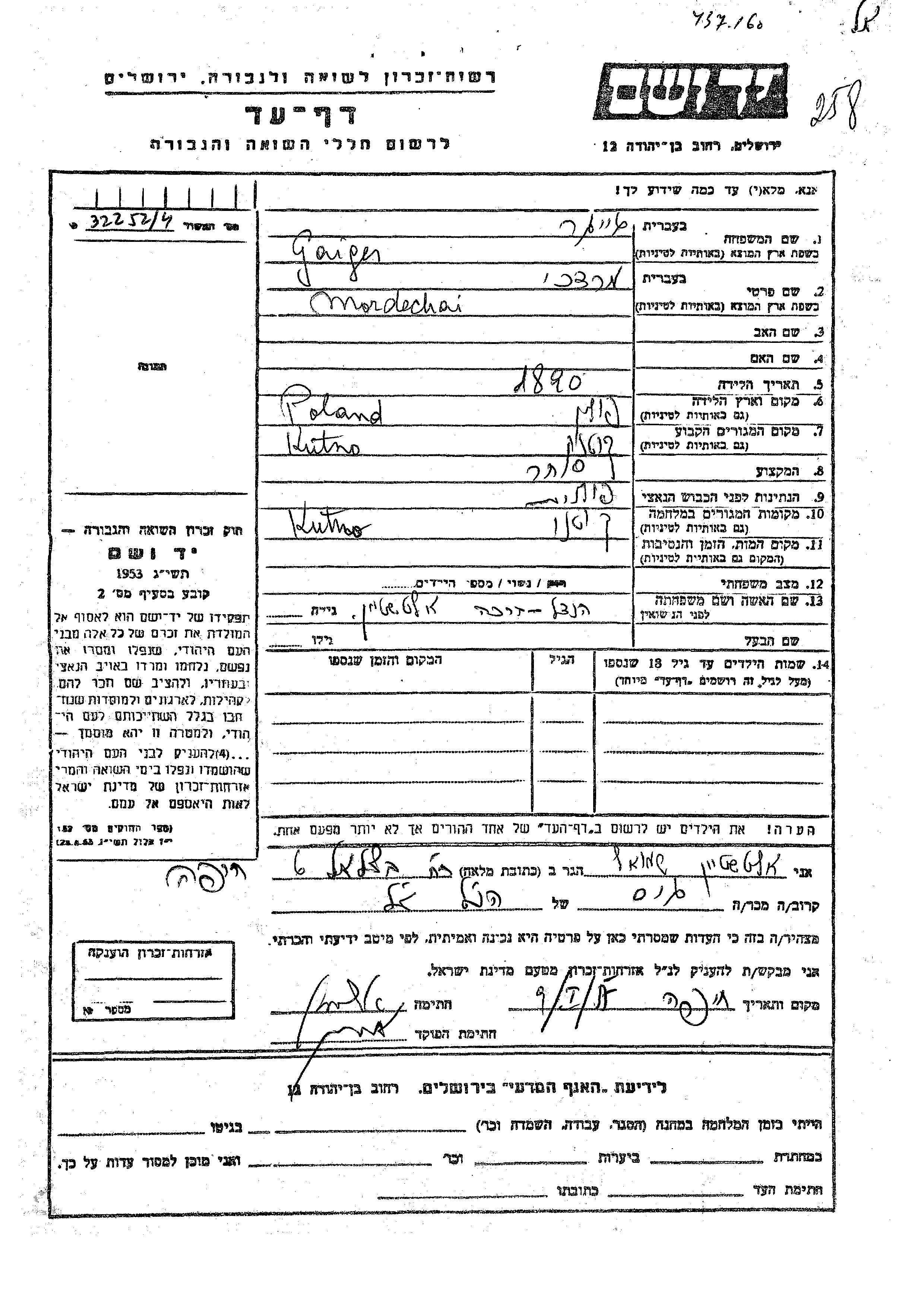 Mordechai Gaiger wurde im Jahr 1890 in Polen geboren. Er war Kaufmann/-frau und mit Hendel Brakha, geb. Altshtein Verheiratet. Vor dem Zweiten Weltkrieg lebte er in Kutno, Polen. Während des Krieges war er in Kutno, Polen.