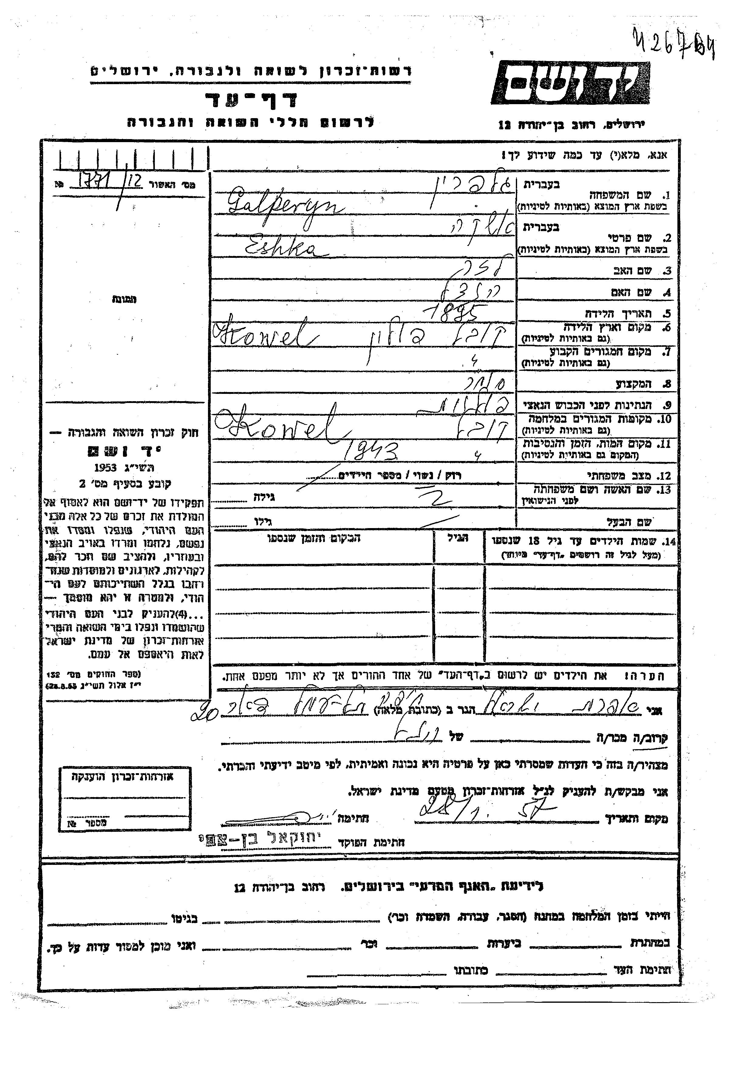 Eshka Galperyn wurde im Jahr 1895 in Kowel, Polen geboren. Sie war die Tochter von Lazar und Hendel. Sie war Kaufmann/-frau und Verheiratet. Vor dem Zweiten Weltkrieg lebte sie in Kowel, Polen. Während des Krieges war sie in Kowel, Polen.