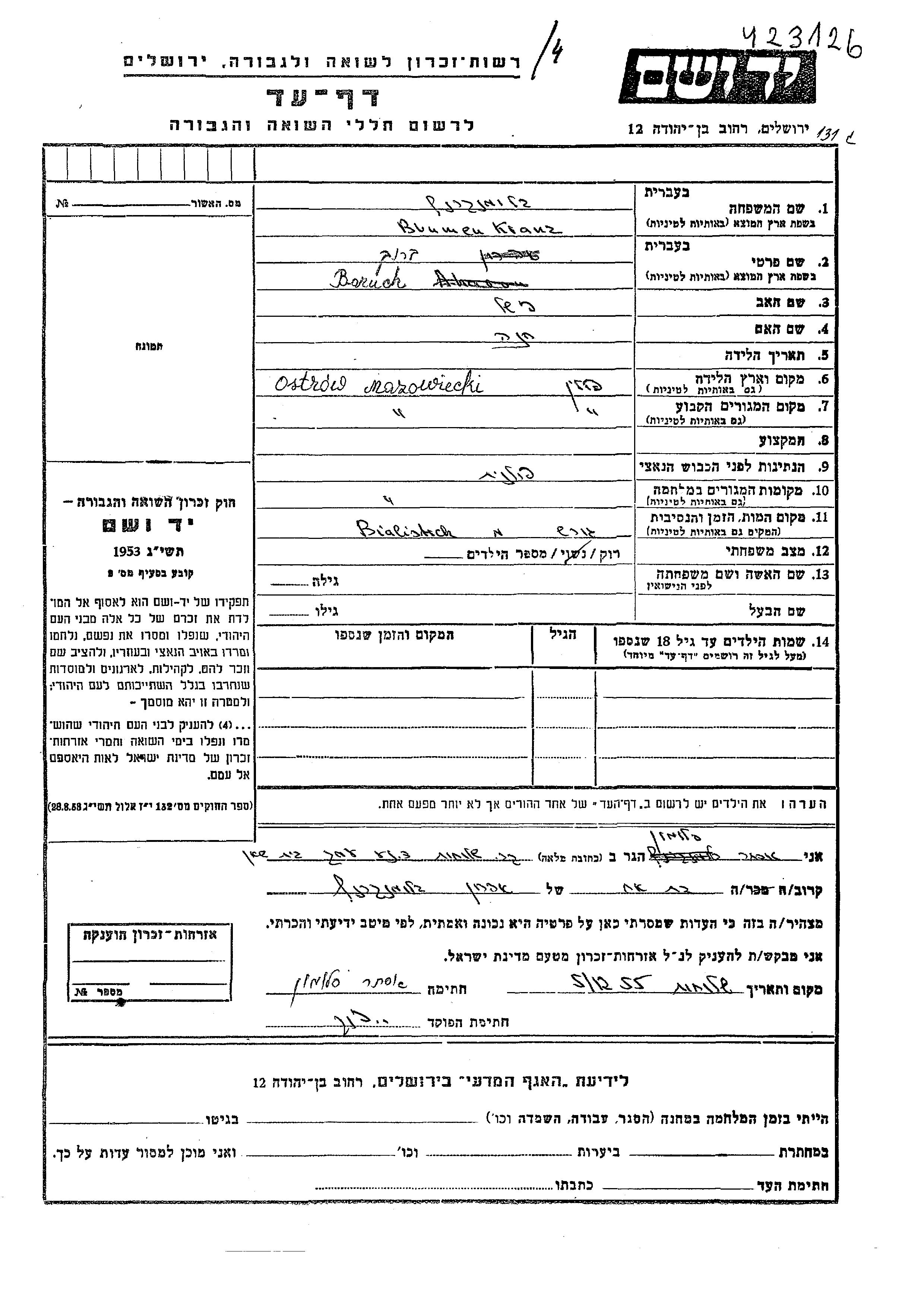 Blumenkranz Baruch Ostrów Mazowiecka, Polen Gedenkblatt