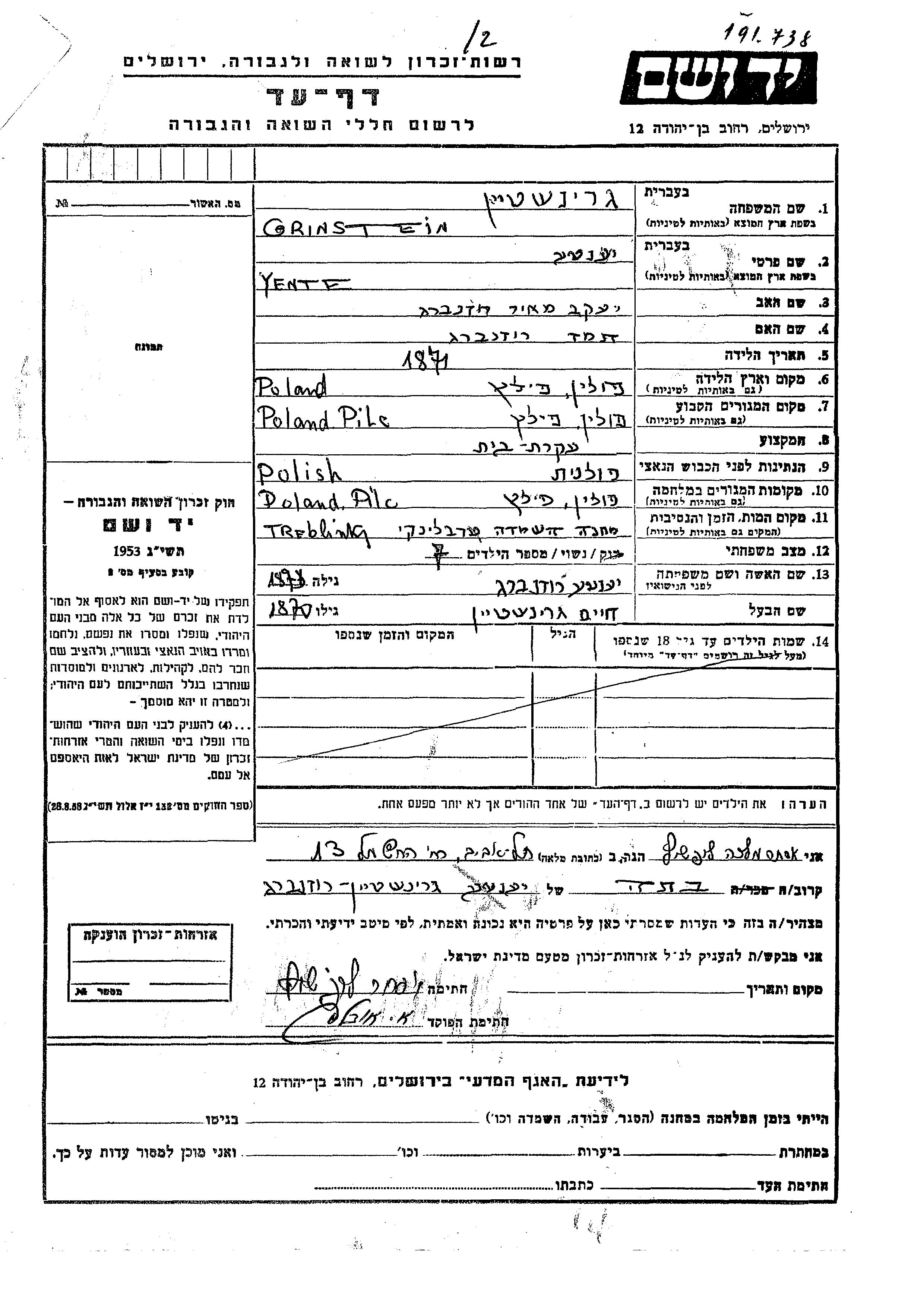 Yente Grinstein, geb. Rozenberg wurde im Jahr 1871 in Pilica, Polen geboren. Sie war die Tochter von Yaakov Meir und Tamar. Sie war Hausfrau und mit Khaim Verheiratet. Vor dem Zweiten Weltkrieg lebte sie in Pilica, Polen. Während des Krieges war sie in Pilica, Polen.