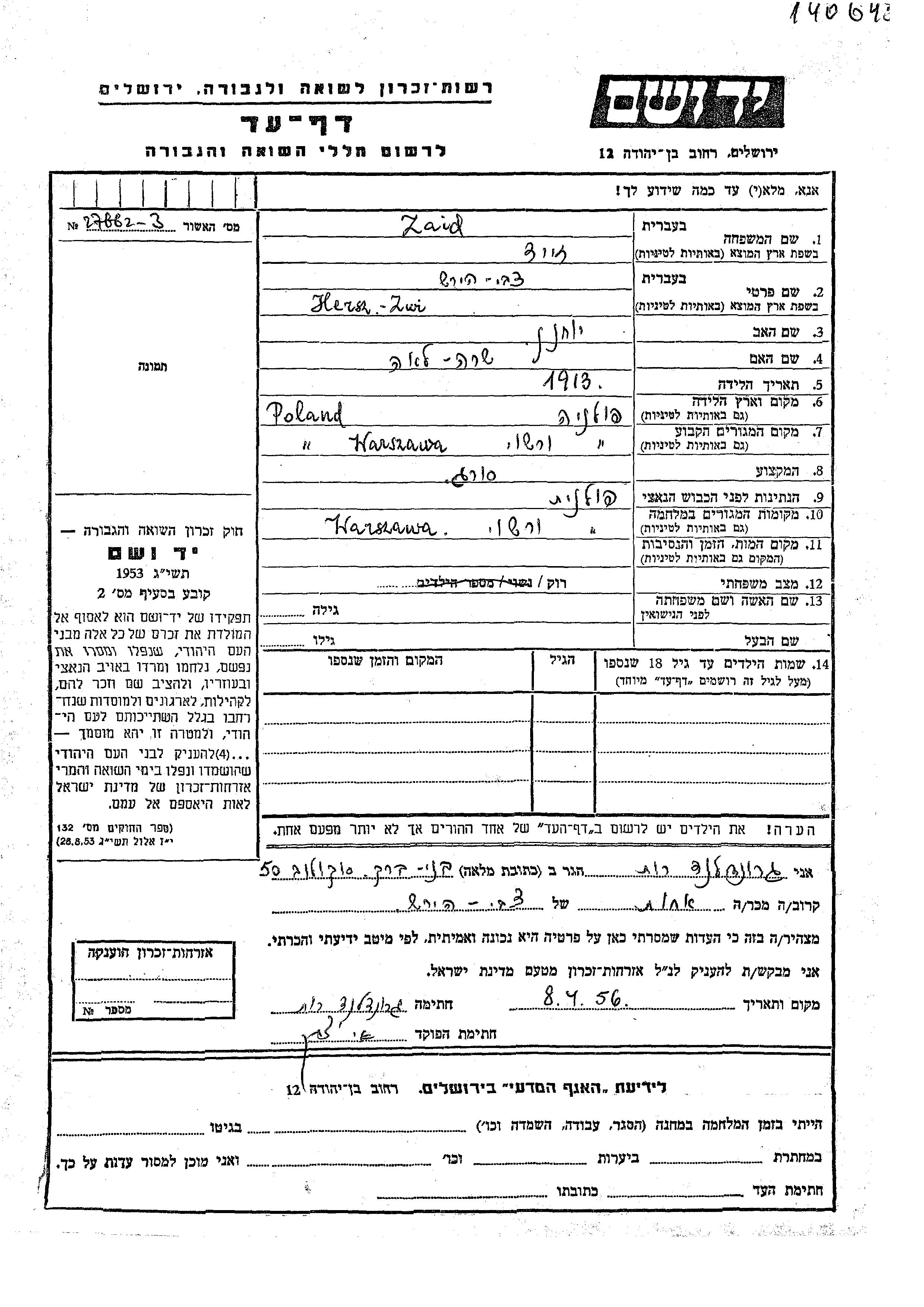 Hersz Zwi Zaid wurde im Jahr 1913 in Polen geboren. Er war der Sohn von Yokhanan und Sara Lea. Er war Stricker/-in und Ledig. Vor dem Zweiten Weltkrieg lebte er in Warsaw, Polen. Während des Krieges war er in Warsaw, Polen.