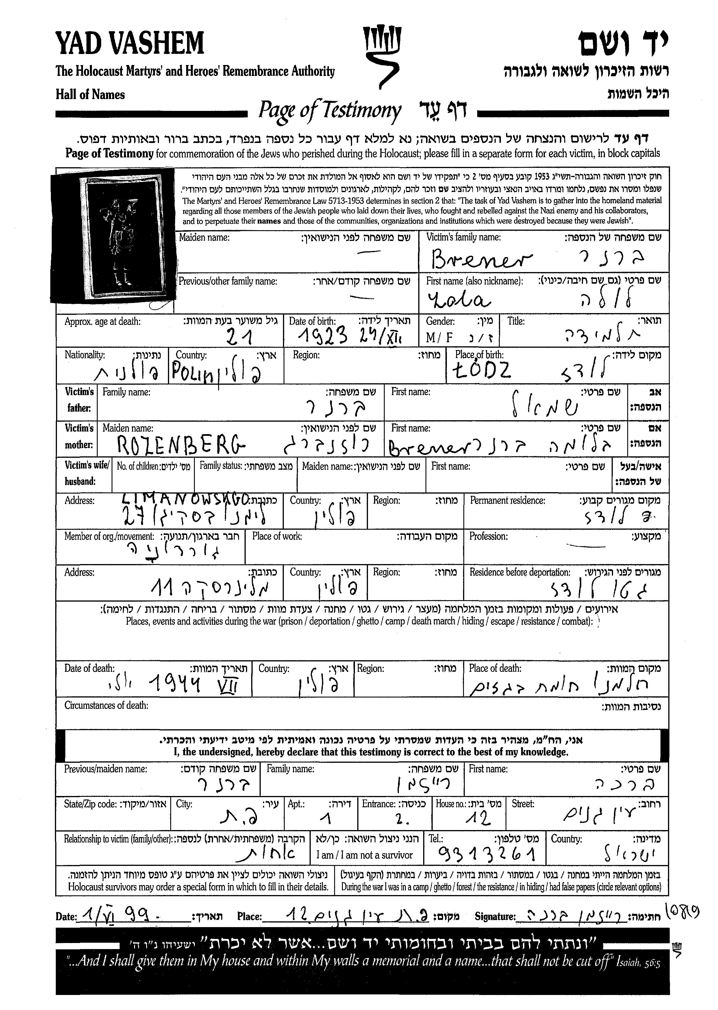 Lola Lea Brener wurde im Jahr 1923 in Lodz, Polen geboren. Sie war die Tochter von Shmuel und Bluma. Sie war Schüler/-in und Ledig. Vor dem Zweiten Weltkrieg lebte sie in Lodz, Polen. Während des Krieges war sie in Lodz, Polen.