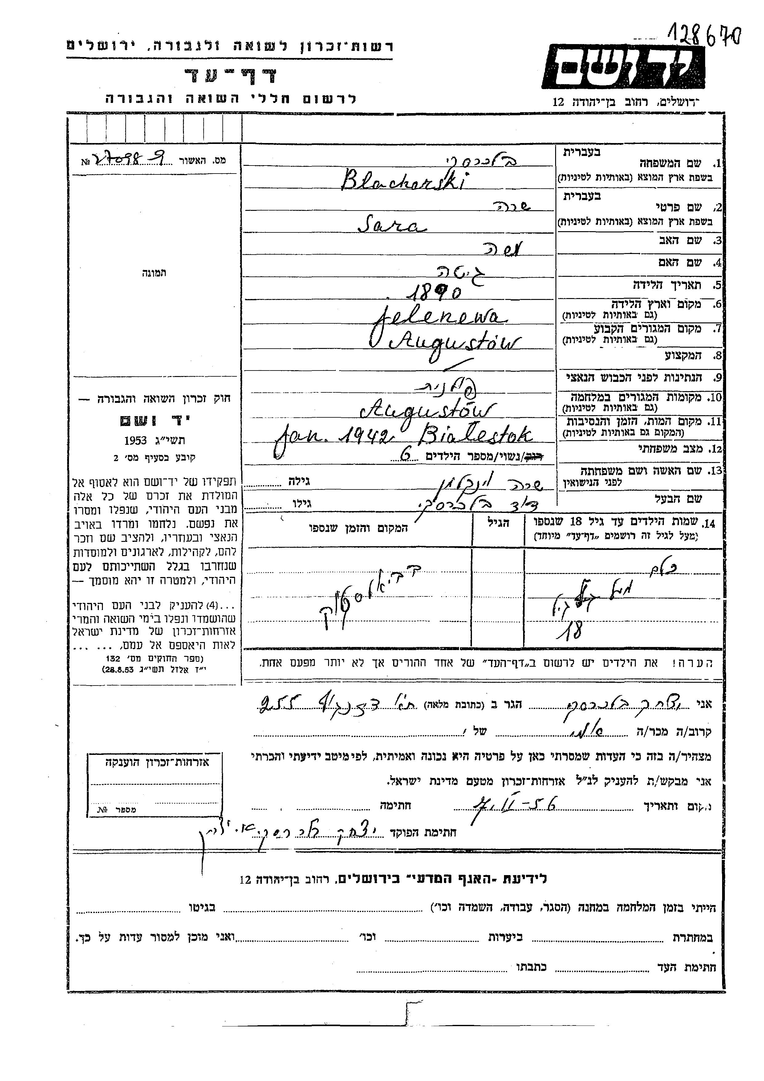 Sara wurde in der Schoah ermordet. Todesort: Bialystok, Polen im Jahr 01/1942.