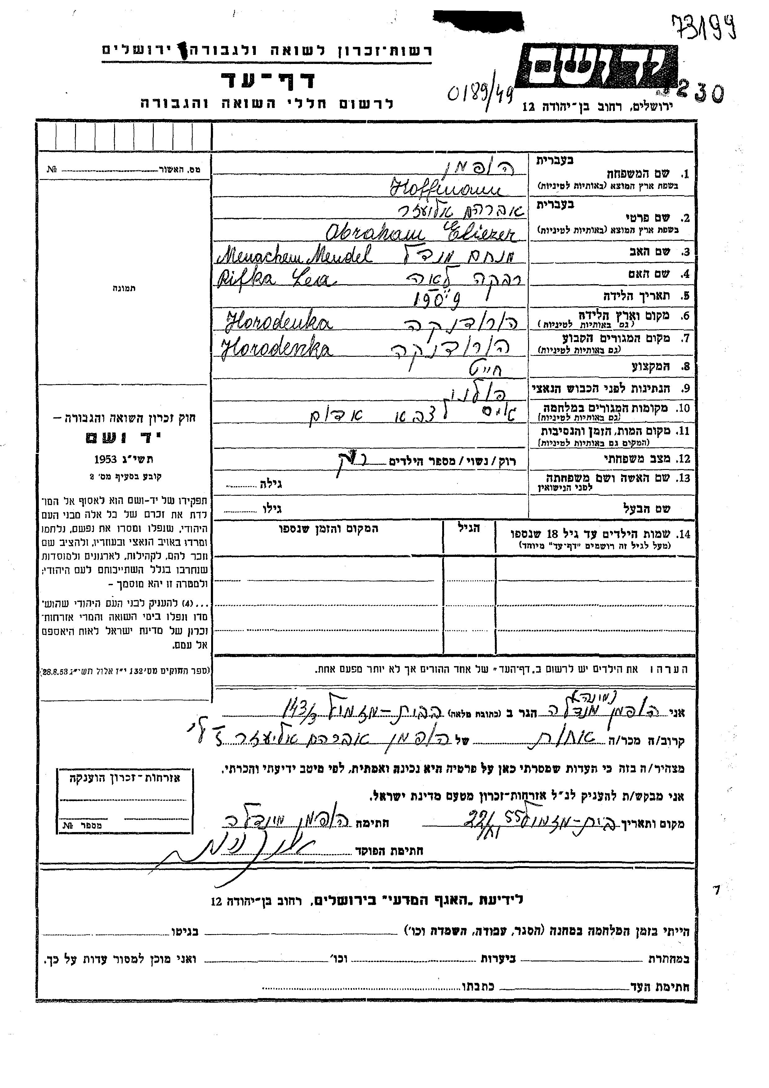 Abraham Eliezer Hoffmann wurde im Jahr 1909 in Horodenka, Polen geboren. Er war der Sohn von Menachem Mendel und Rivka Lea. Er war Schneider und Ledig. Vor dem Zweiten Weltkrieg lebte er in Horodenka, Polen.