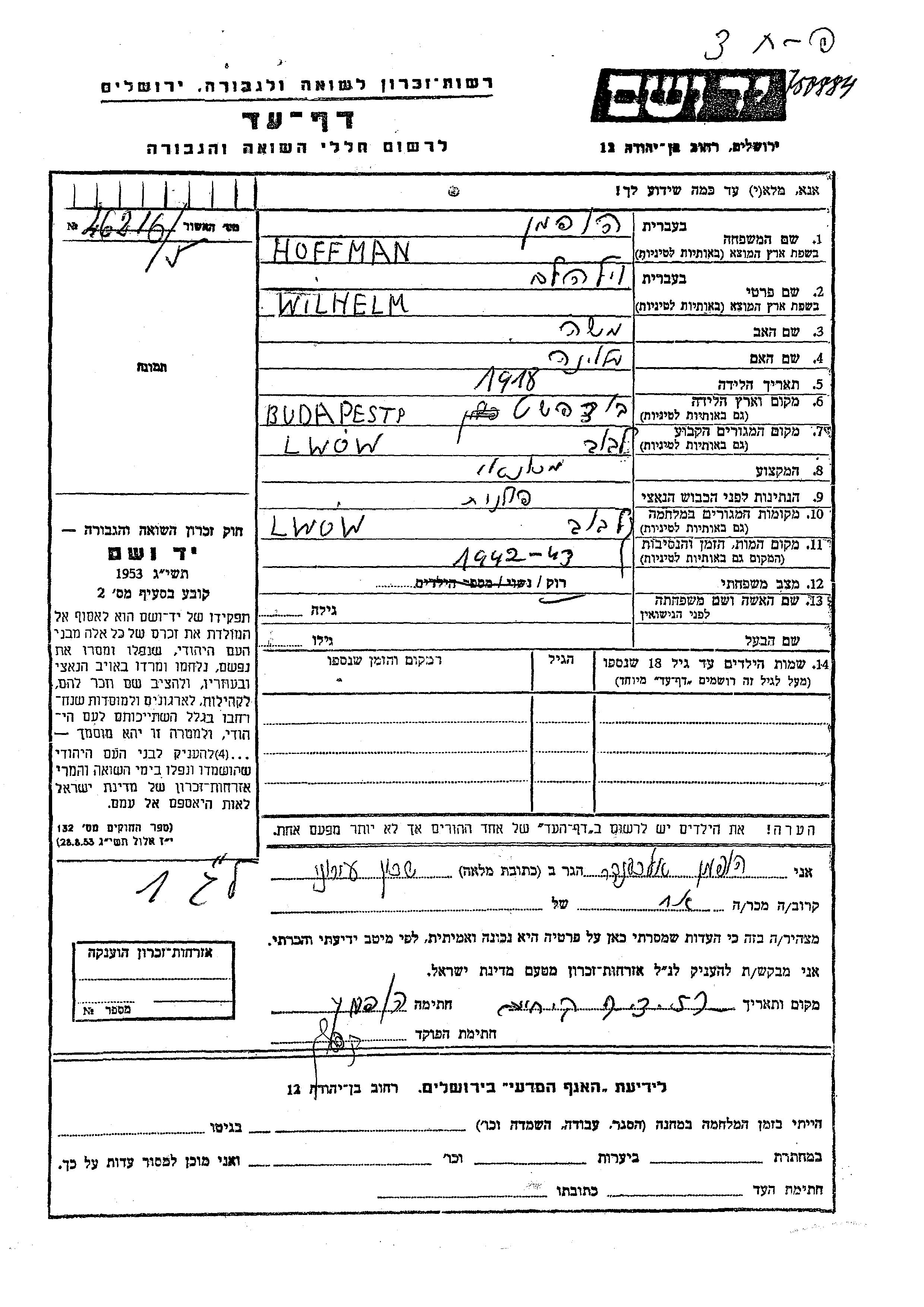 Wilhelm Hoffman wurde im Jahr 1918 in Budapest, Ungarn geboren. Er war der Sohn von Moshe und Malvina. Er war Mechaniker/-in und Ledig. Vor dem Zweiten Weltkrieg lebte er in Lwow, Polen. Während des Krieges war er in Lwow, Polen.