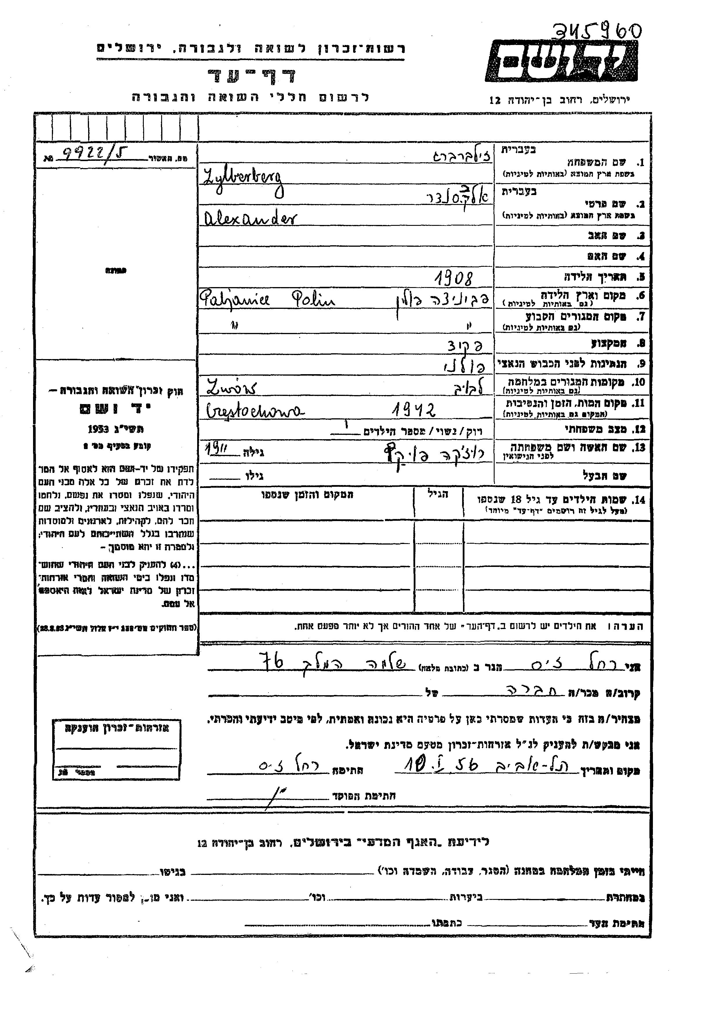 Zylberberg Alexander 1908 Pabjanice, Polen Gedenkblatt
