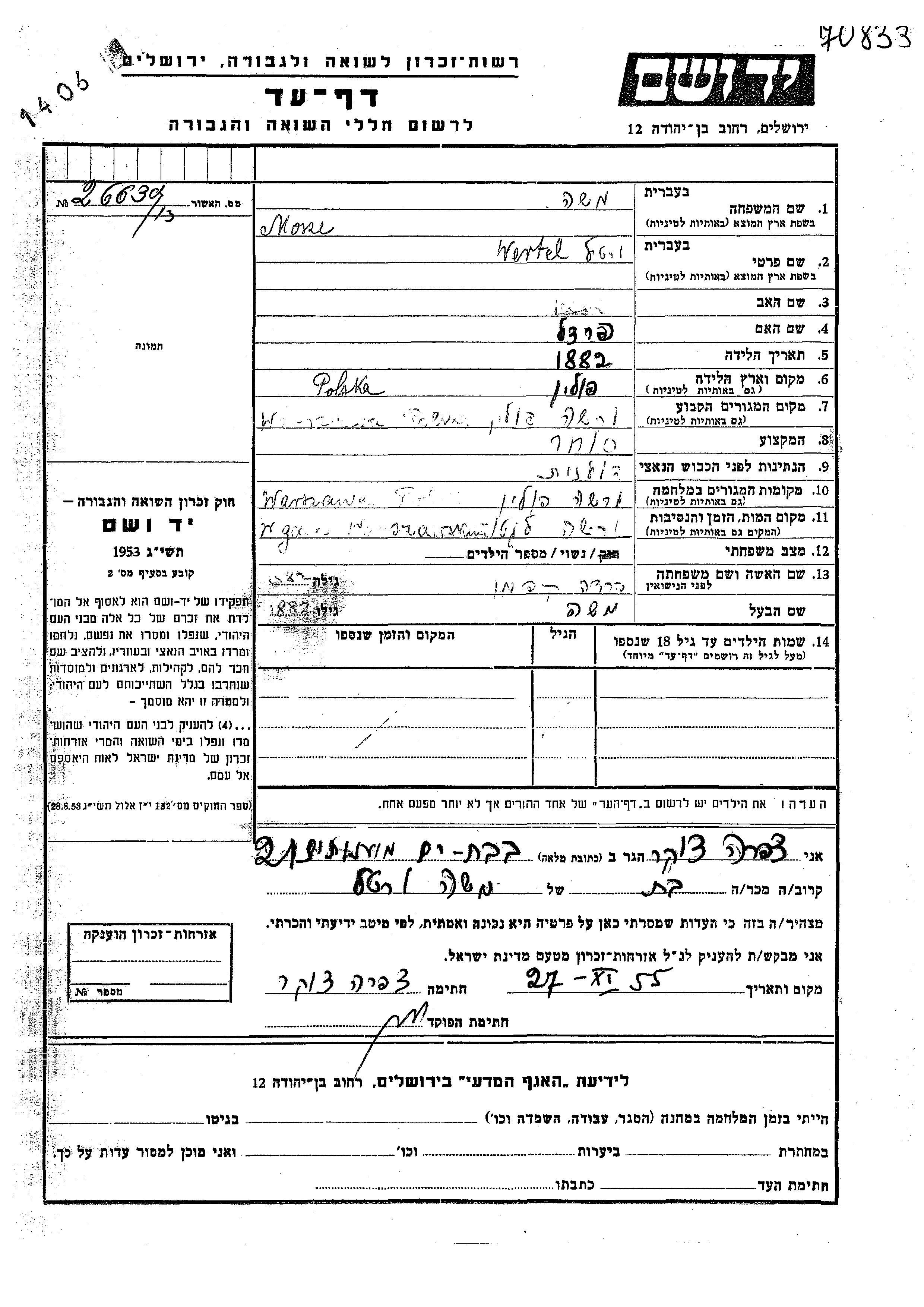 Mosze Vertel wurde im Jahr 1882 in Polen geboren. Er war der Sohn von Fradel. Er war Kaufmann/-frau und mit Freida, geb. Kafeman Verheiratet. Vor dem Zweiten Weltkrieg lebte er in Warszawa, Polen. Während des Krieges war er in Warszawa, Polen.