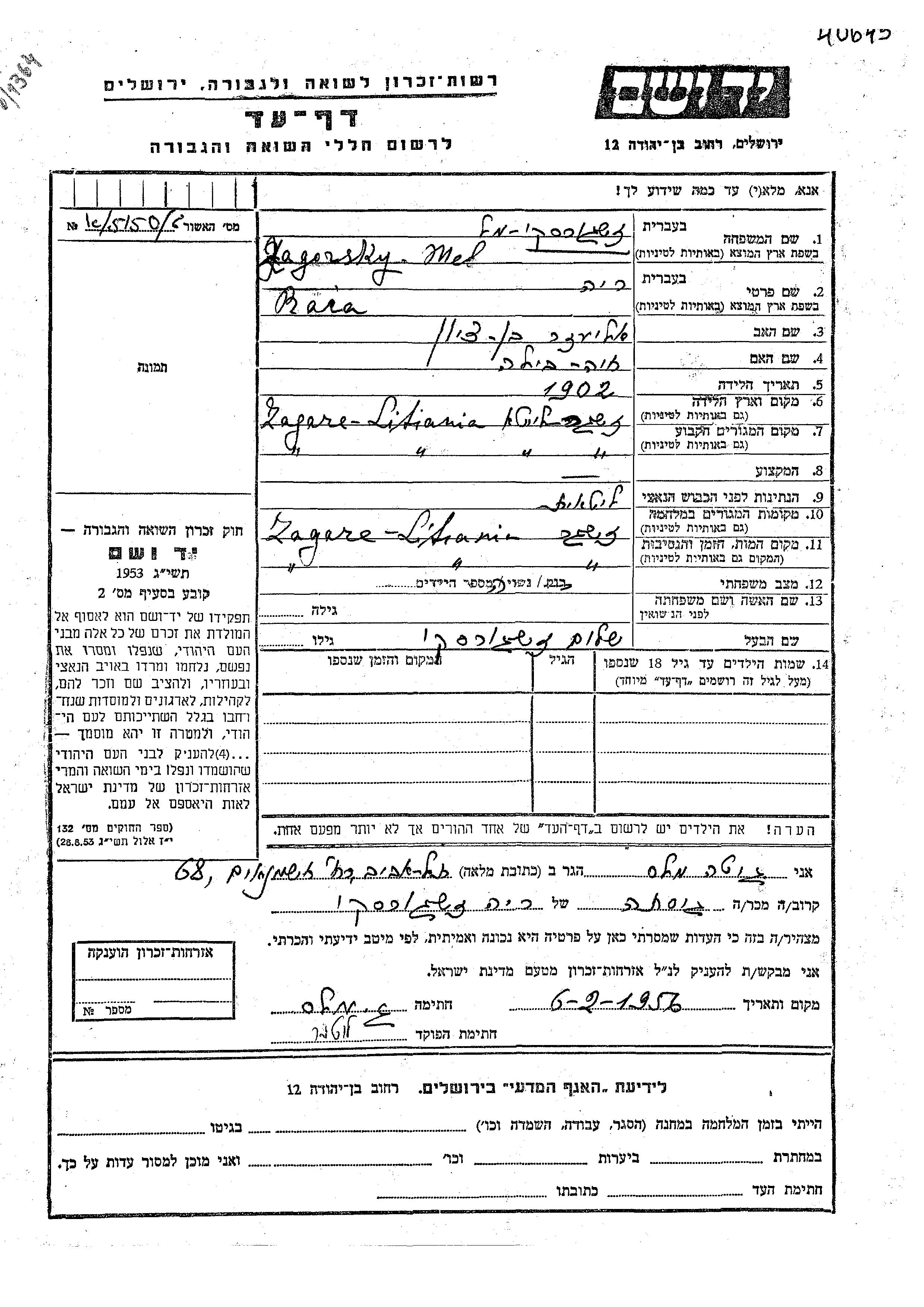 Raia Zagorsky Mel wurde im Jahr 1902 in Žagarė, Litauen geboren. Sie war die Tochter von Eliezer Bentzion und Khaia Bila. Sie war mit Shalom Verheiratet. Vor dem Zweiten Weltkrieg lebte sie in Žagarė, Litauen. Während des Krieges war sie in Žagarė, Litauen.