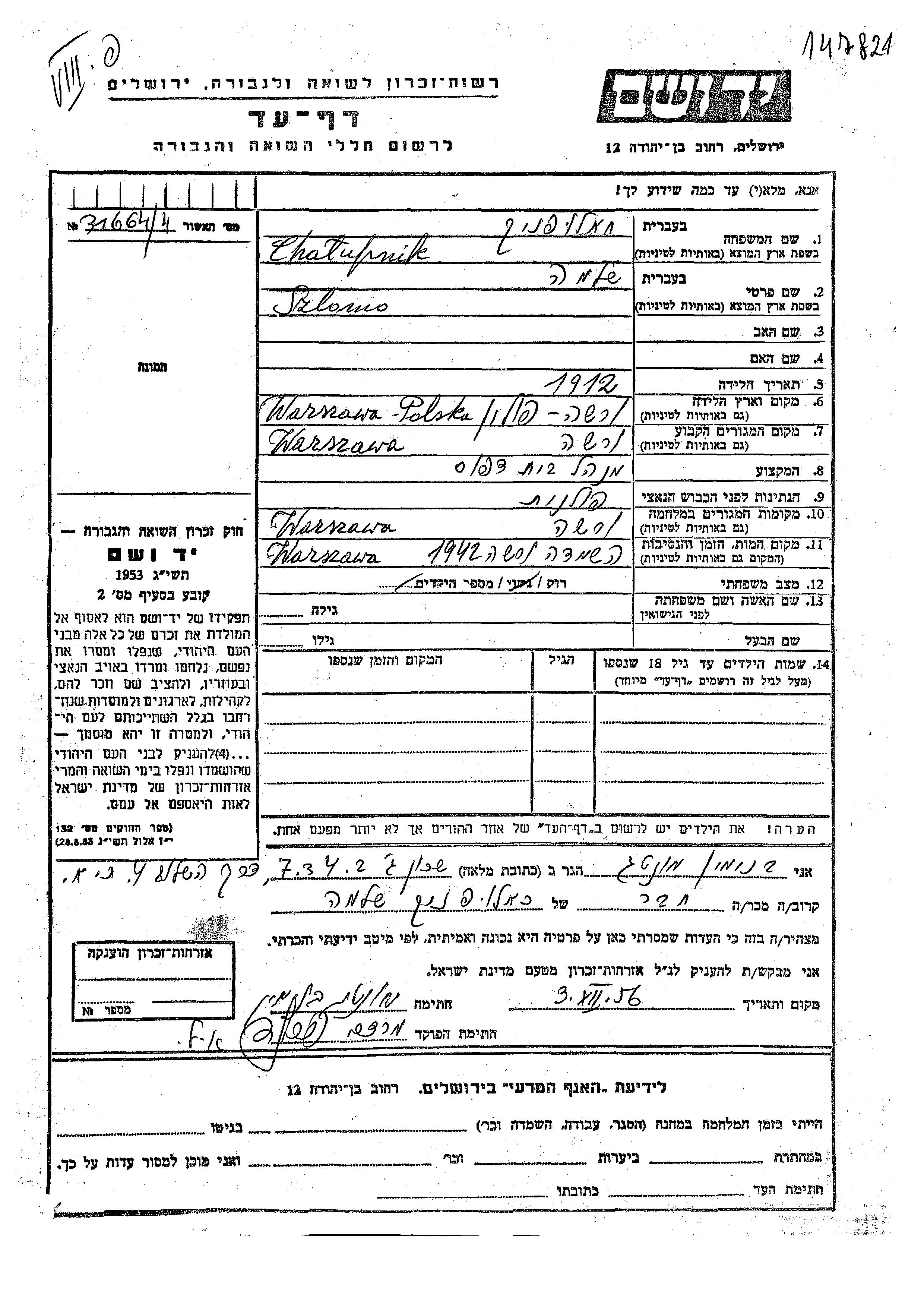 Szlomo Chalupnik wurde im Jahr 1912 in Warsaw, Polen geboren. Er war Leiter einer druckerei und Ledig. Vor dem Zweiten Weltkrieg lebte er in Warsaw, Polen. Während des Krieges war er in Warsaw, Polen.