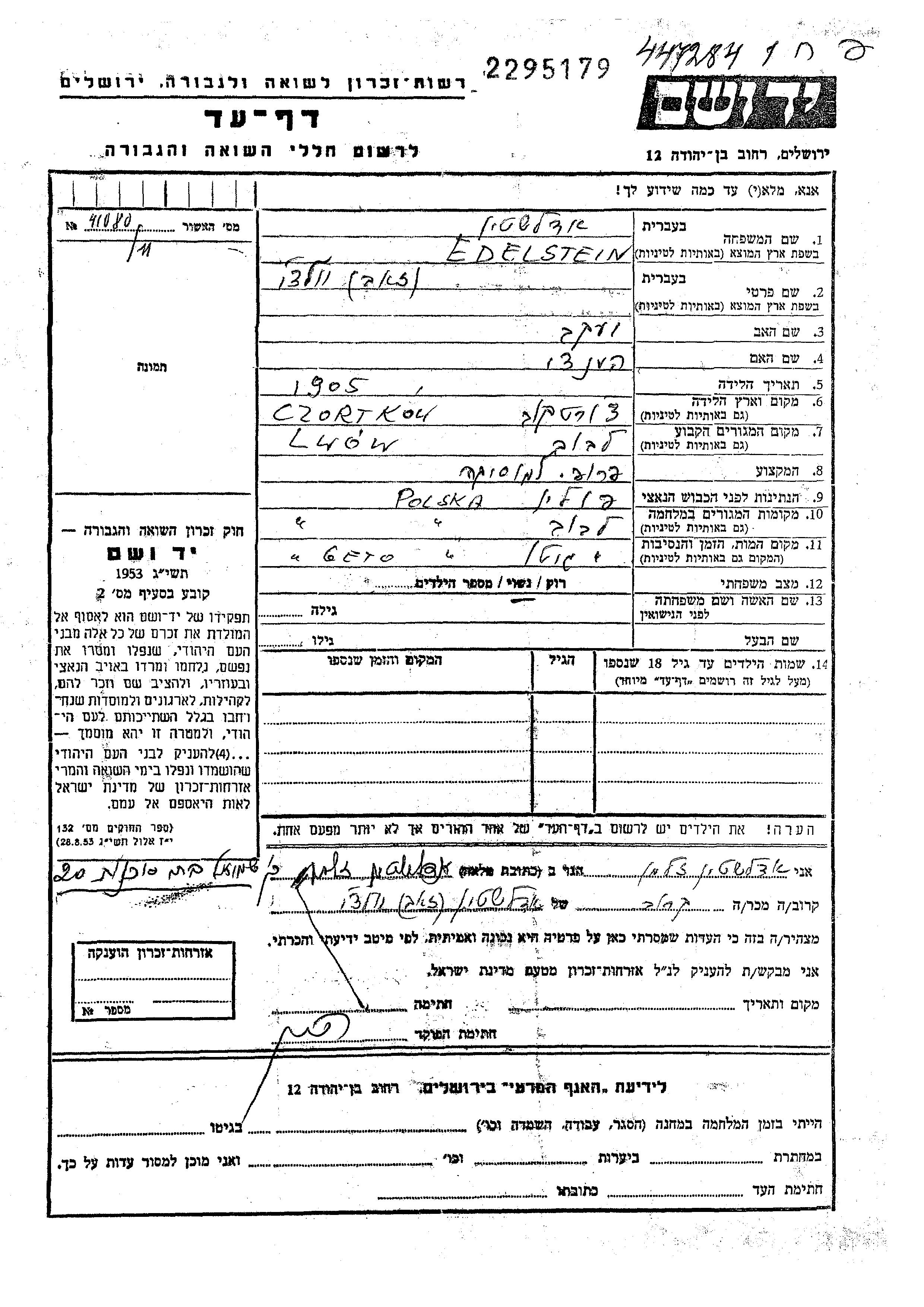Prof. Voltzo Zeev Edelstein wurde im Jahr 1905 in Czortkow, Polen geboren. Er war der Sohn von Yaakov und Khana. Er war Musikprofessor und Verheiratet. Vor dem Zweiten Weltkrieg lebte er in Lwow, Polen. Während des Krieges war er in Lwow, Polen.