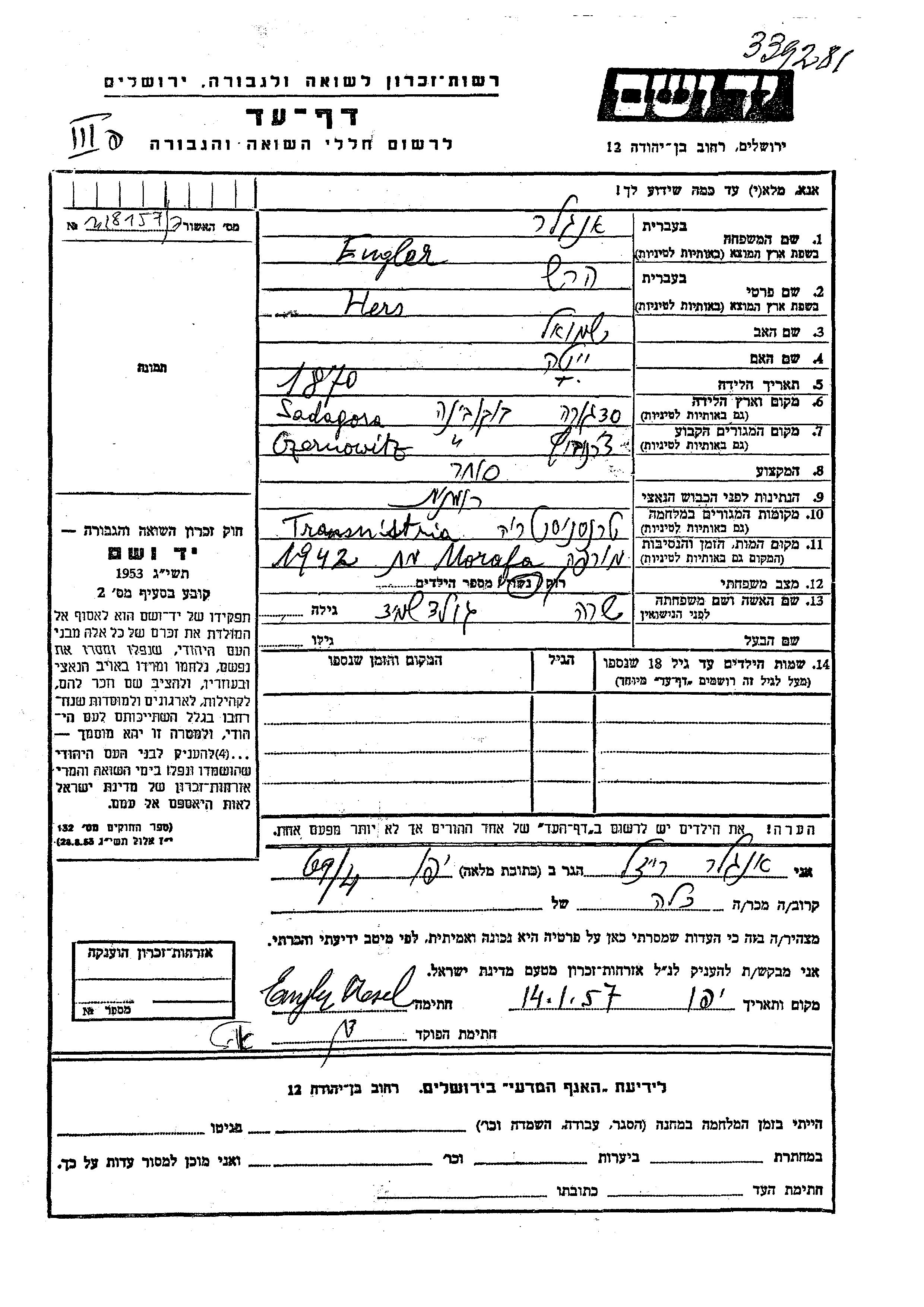 Hers Engler wurde im Jahr 1870 in Sadagura, Rumänien geboren. Er war der Sohn von Shmuel und Ita. Er war Kaufmann/-frau und mit Sara, geb. Goldshmit Verheiratet. Vor dem Zweiten Weltkrieg lebte er in Czernowitz, Rumänien. Während des Krieges war er in Transnistria, Ukraine (UdSSR).
