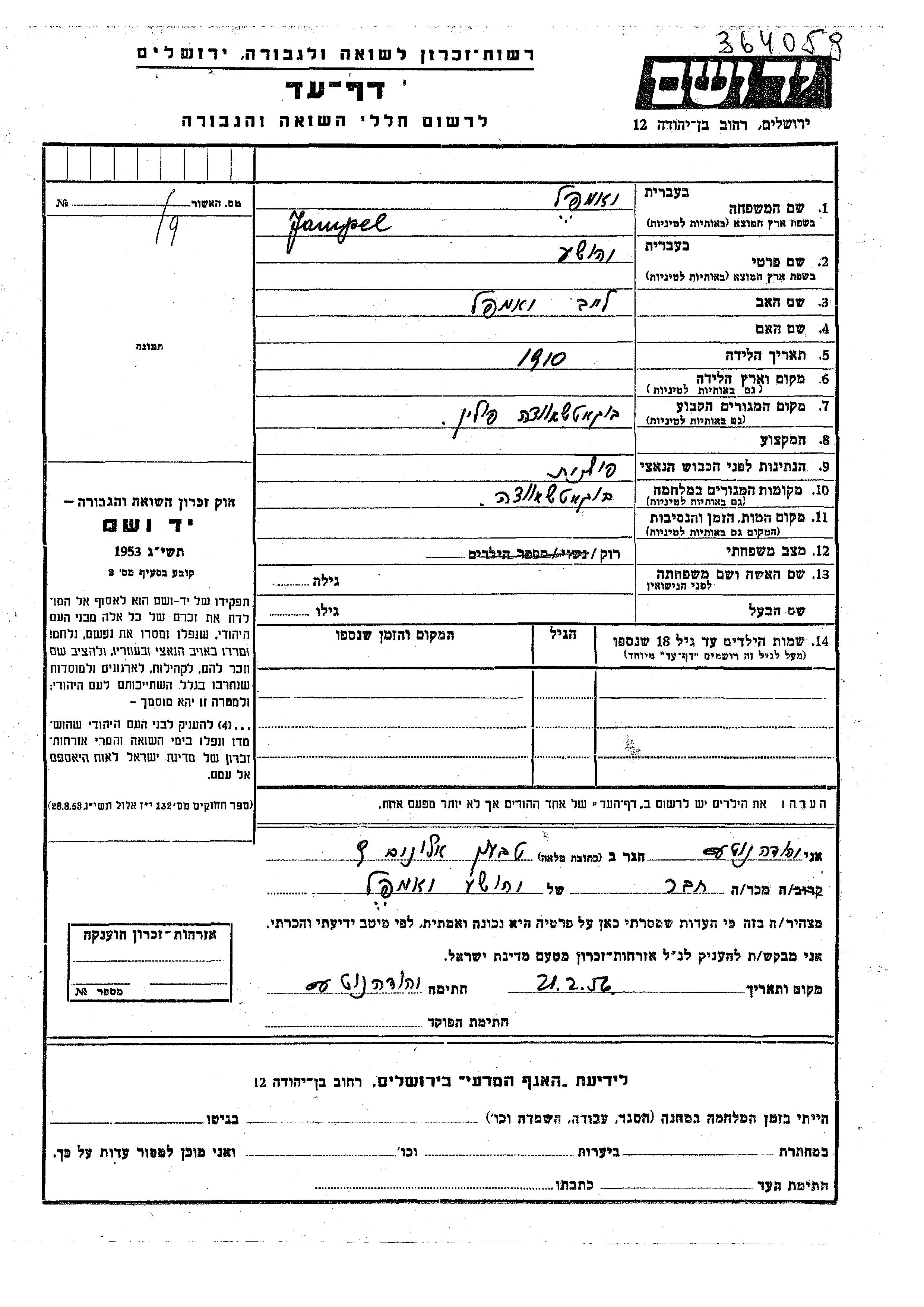 Yehoshua Jampel wurde im Jahr 1910 geboren. Er war der Sohn von Leib. Er war Ledig. Vor dem Zweiten Weltkrieg lebte er in Bukachivtsi, Polen. Während des Krieges war er in Bukachivtsi, Polen.