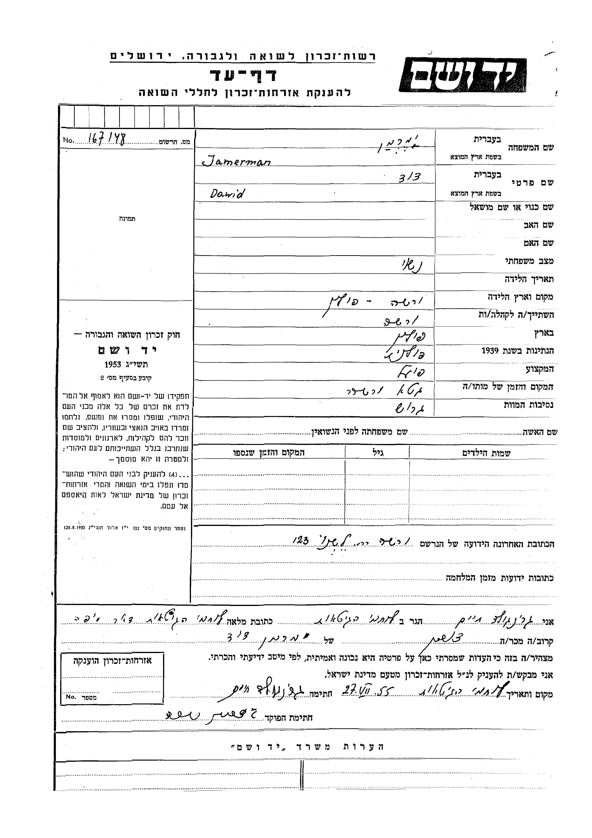 Dawid Jamerman wurde in Warsaw, Polen geboren. Er war Arbeiter/-in und Verheiratet. Während des Krieges war er in Warsaw, Polen.