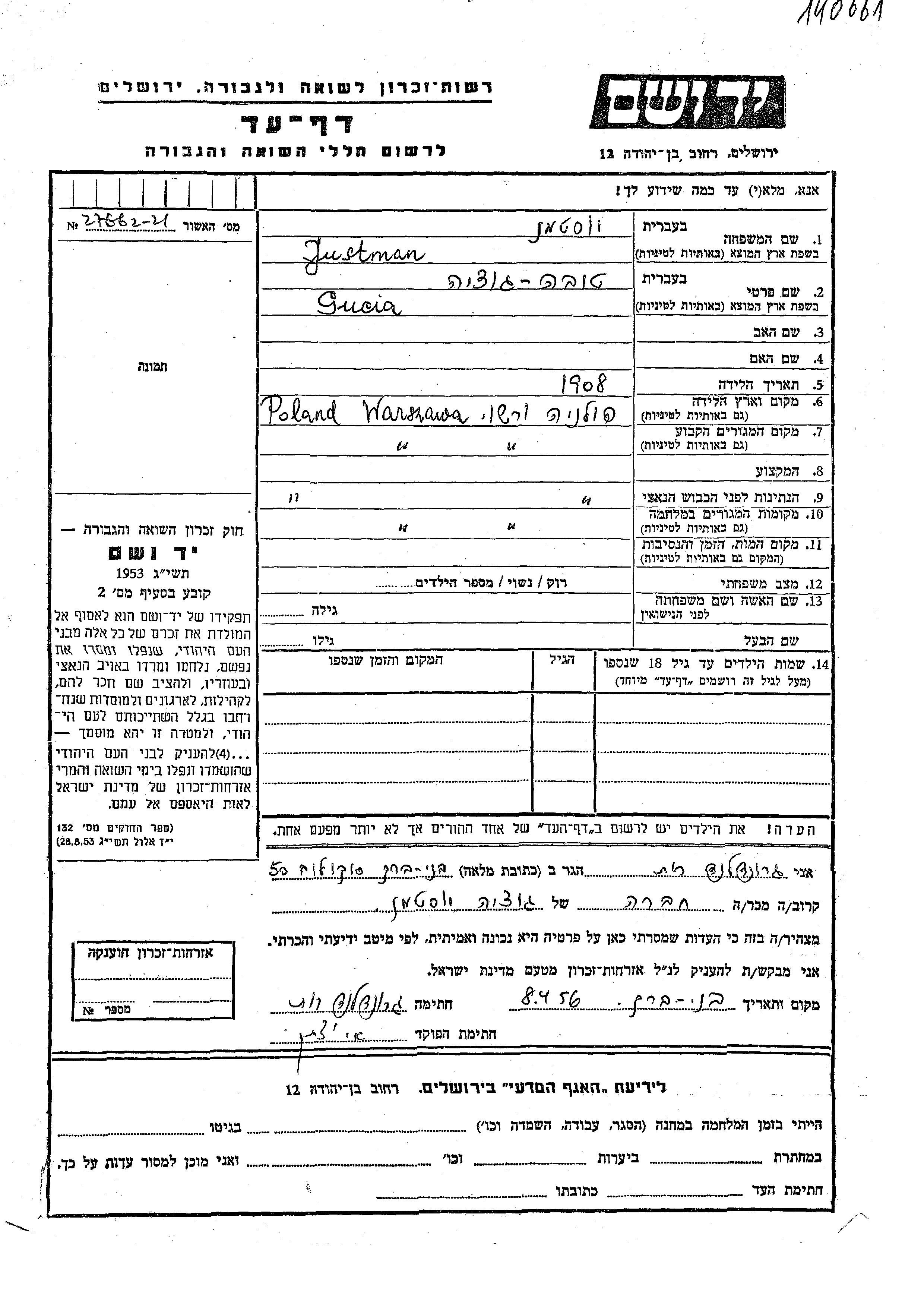 Gucia Tova Yustman wurde im Jahr 1908 in Warsaw, Polen geboren. Vor dem Zweiten Weltkrieg lebte sie in Warsaw, Polen. Während des Krieges war sie in Warsaw, Polen.