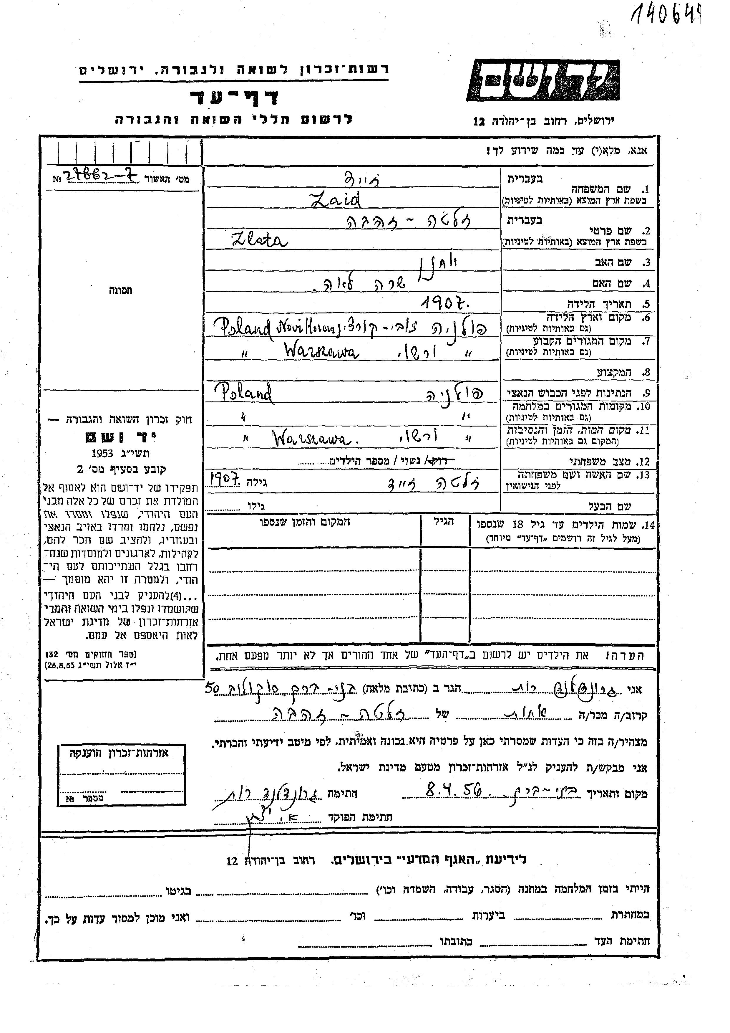 Zlata Zahava Zaid wurde im Jahr 1907 in Nowy Korczyn, Polen geboren. Sie war die Tochter von Yokhanan und Sara Lea. Sie war Verheiratet. Vor dem Zweiten Weltkrieg lebte sie in Warsaw, Polen. Während des Krieges war sie in Polen.