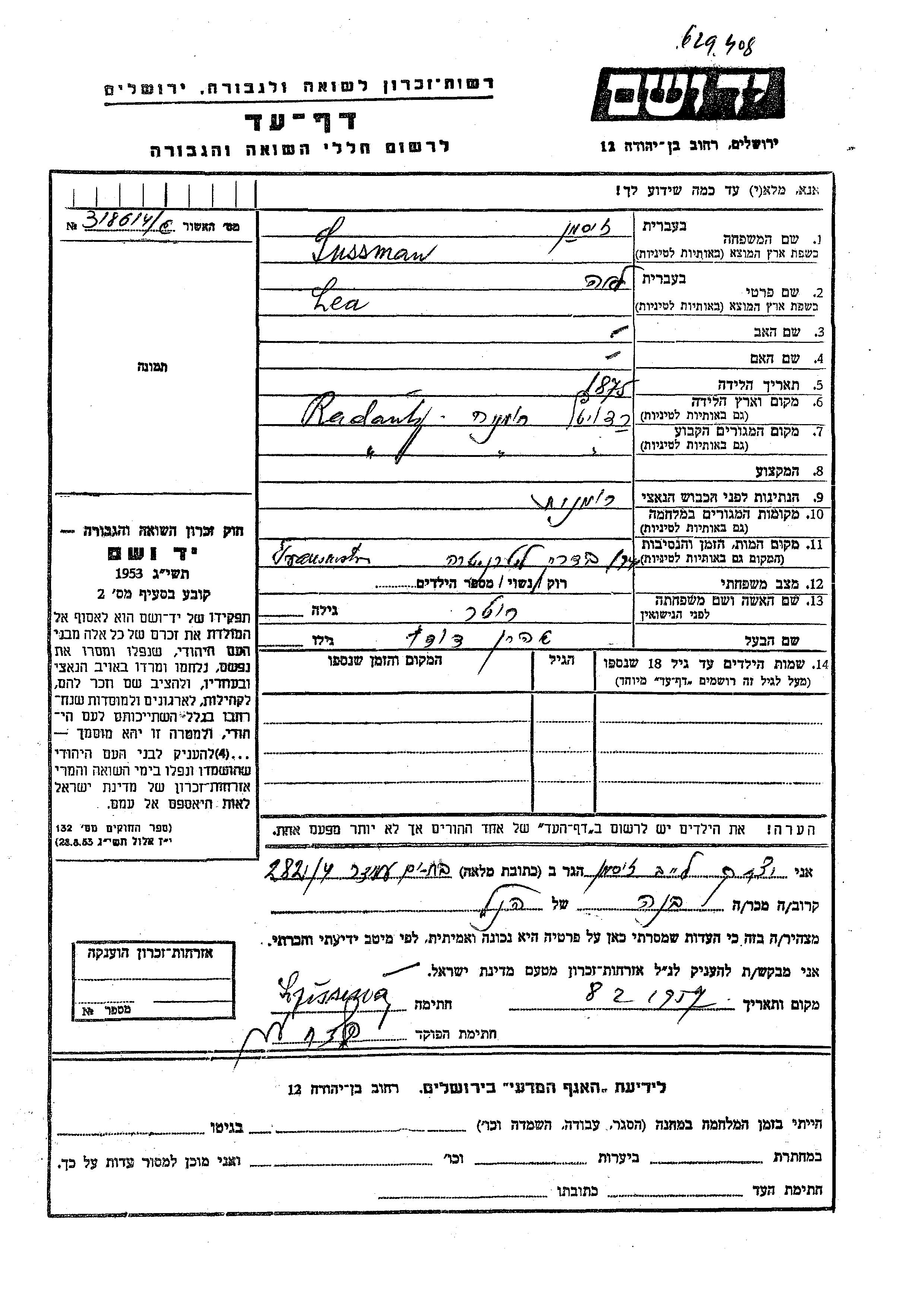 Lea Zussman, geb. Riter wurde im Jahr 1875 in Radauti, Rumänien geboren. Sie war mit Aharon David Verheiratet. Vor dem Zweiten Weltkrieg lebte sie in Radauti, Rumänien.