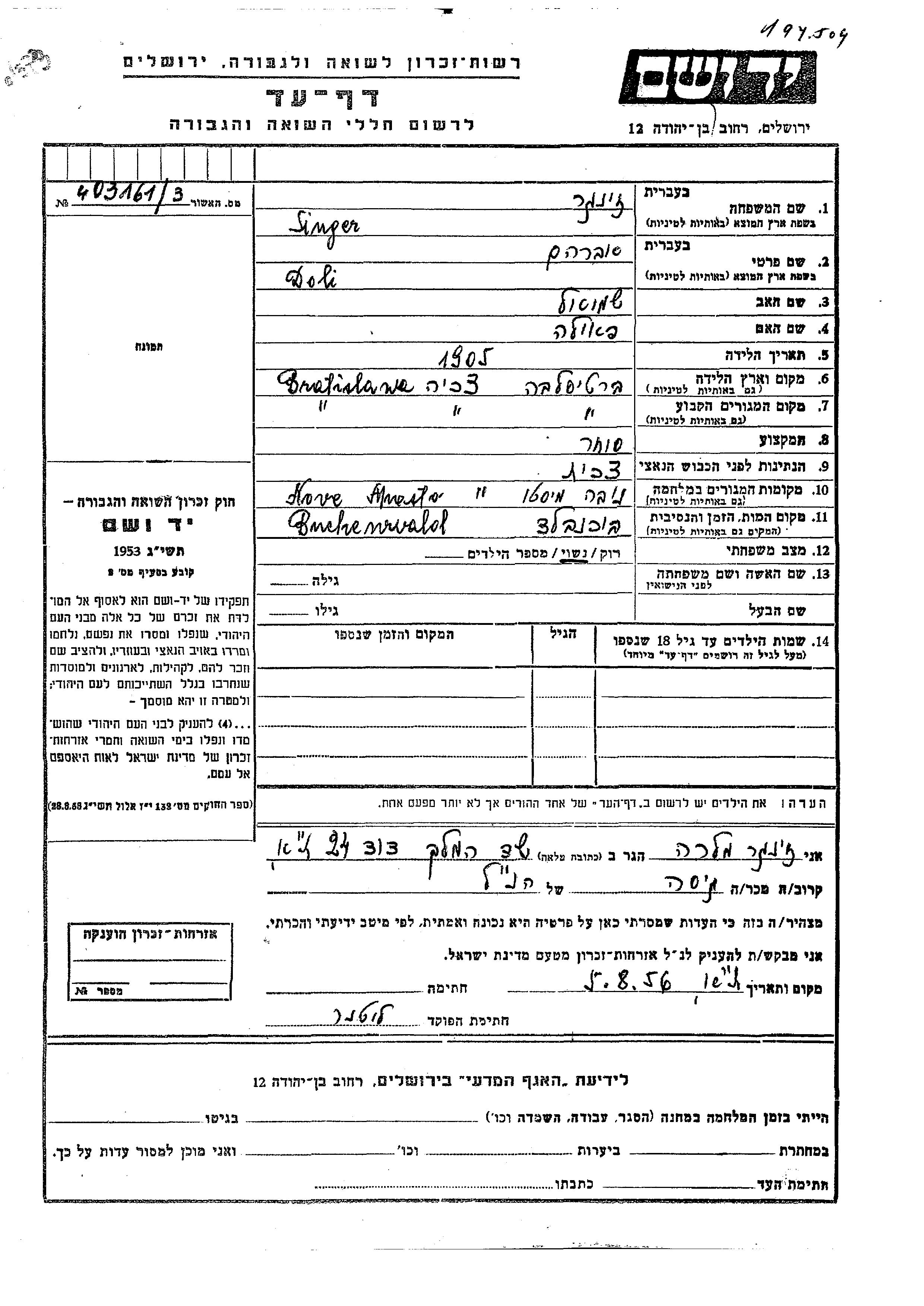 Avraham Doli Singer wurde im Jahr 1905 in Bratislava, Tschechoslowakei geboren. Er war der Sohn von Shmuel und Paula. Er war Kaufmann/-frau. Vor dem Zweiten Weltkrieg lebte er in Bratislava, Tschechoslowakei. Während des Krieges war er in Nove Mesto, Tschechoslowakei.