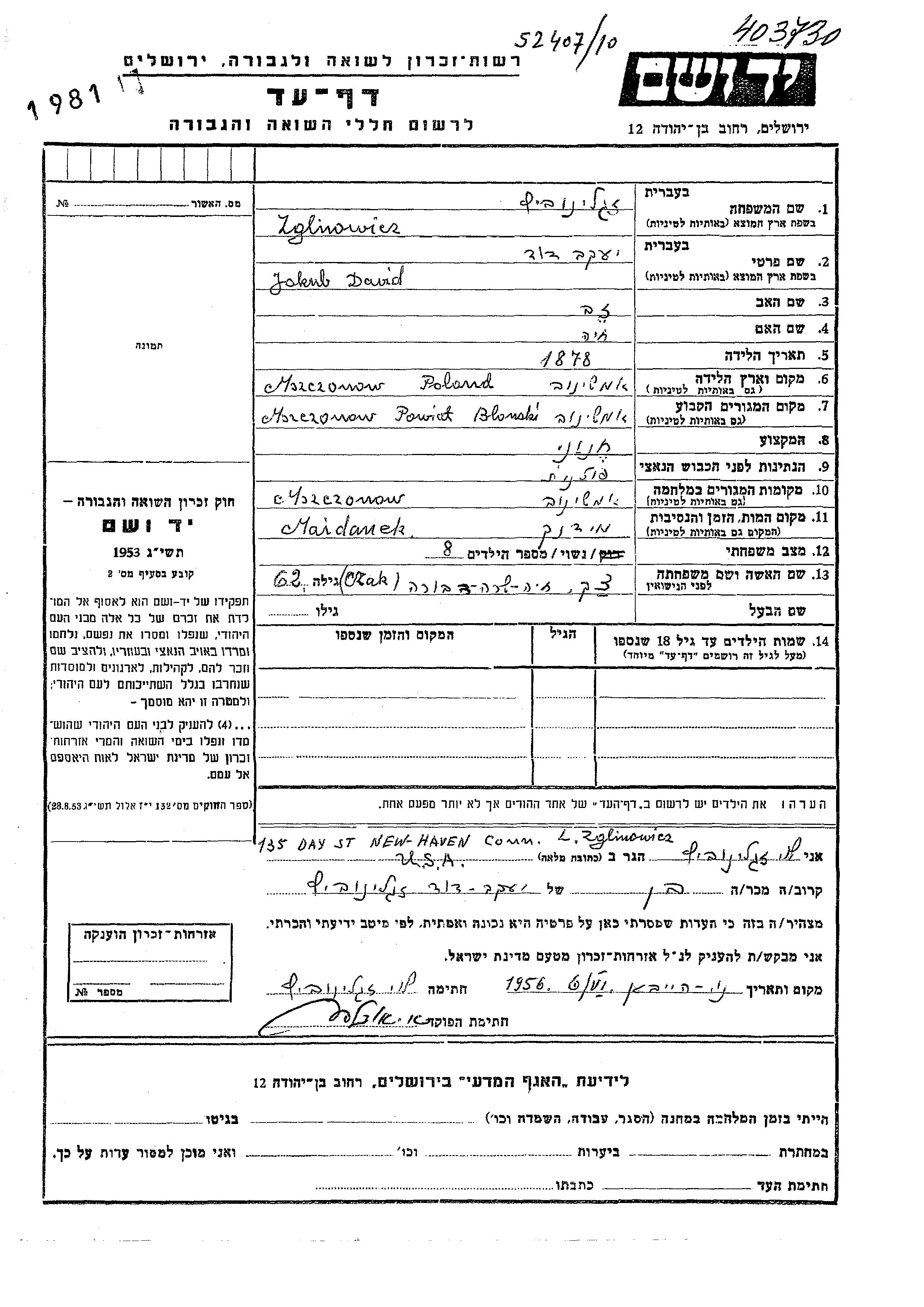 Jakob David Zglinowicz wurde im Jahr 1878 in Mszczonow, Polen geboren. Er war der Sohn von Zeev und Khaia. Er war Lebensmittelhändler/-in und mit Khaia Sara, geb. Czak Chek Verheiratet. Vor dem Zweiten Weltkrieg lebte er in Mszczonow, Polen. Während des Krieges war er in Mszczonow, Polen.